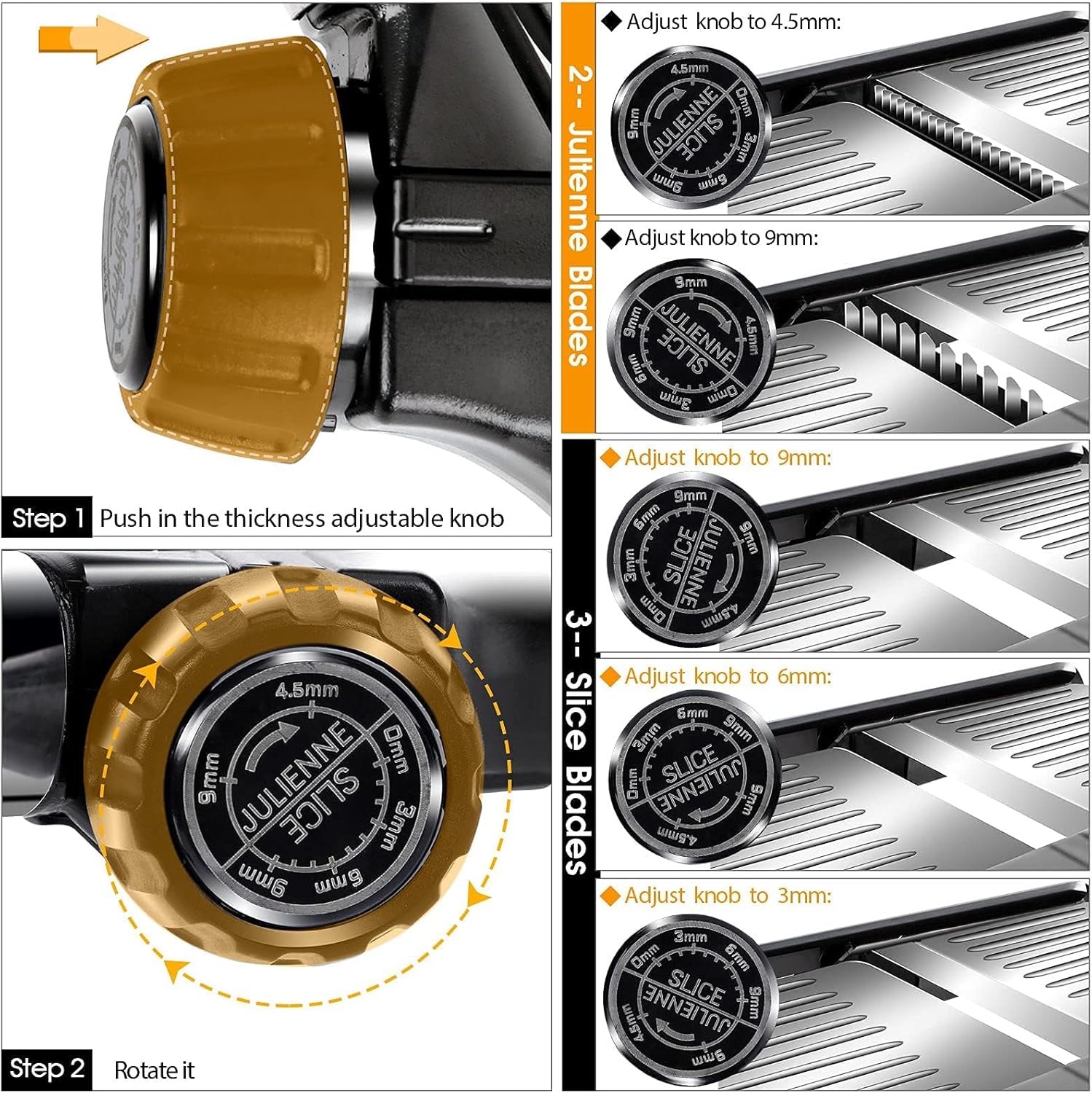 - Adjustable Mandoline Slicer: We designed three kinds of thickness slicing blades-3mm, 6mm and 9mm; two julienne settings-4.5mm and 9mm. With built-in rotating adjustable blade, if need to adjust thickness or change cutting options, just adjust knob, no need to touch the blade.