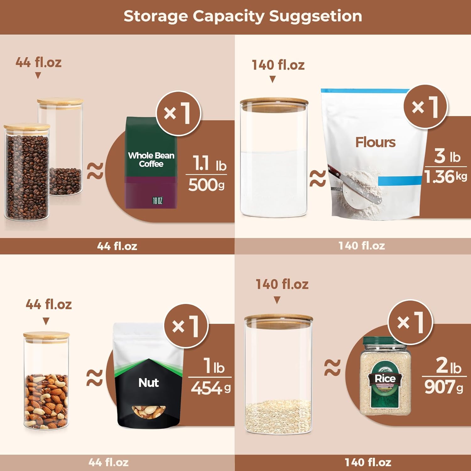 ComSaf Glass Food Storage Containers with Bamboo Lid (1.1Gallon/44oz), Glass Jar with Airtight Lid Clear Glass Food Canister Set of 2 for Dry food like Rice, Sugar, Flour, Pasta, Cereal, Beans, Nuts