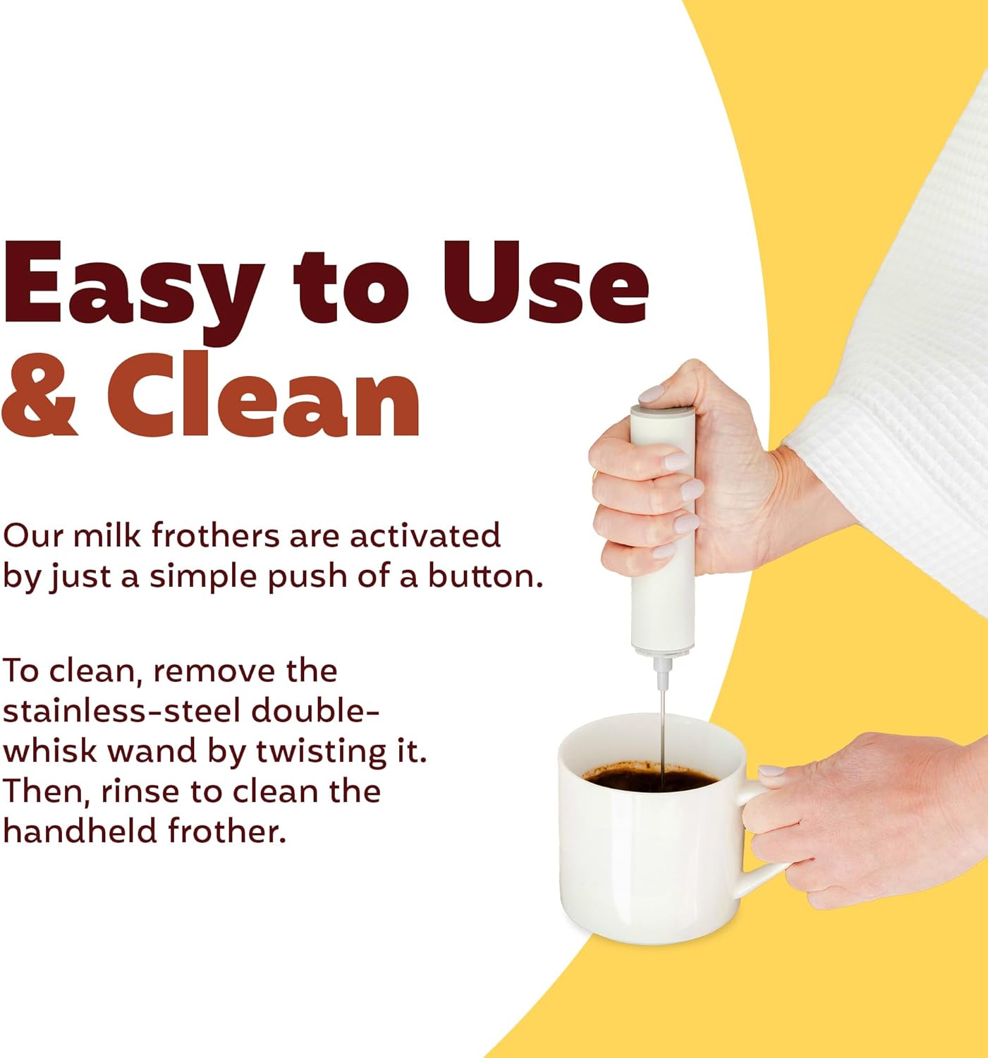 - Easy to Use and Effortless to Clean - Designed for hassle-free use, our USB-powered coffee frother activates instantly with one button. Just twist off the stainless steel double-whisk wand to rinse clean - no disassembly or complicated washing required. Shoppers love how intuitive and low-maintenance it is, especially when they want quick froth with minimal mess. Ideal for busy mornings, office kitchens, or late-night drinks.