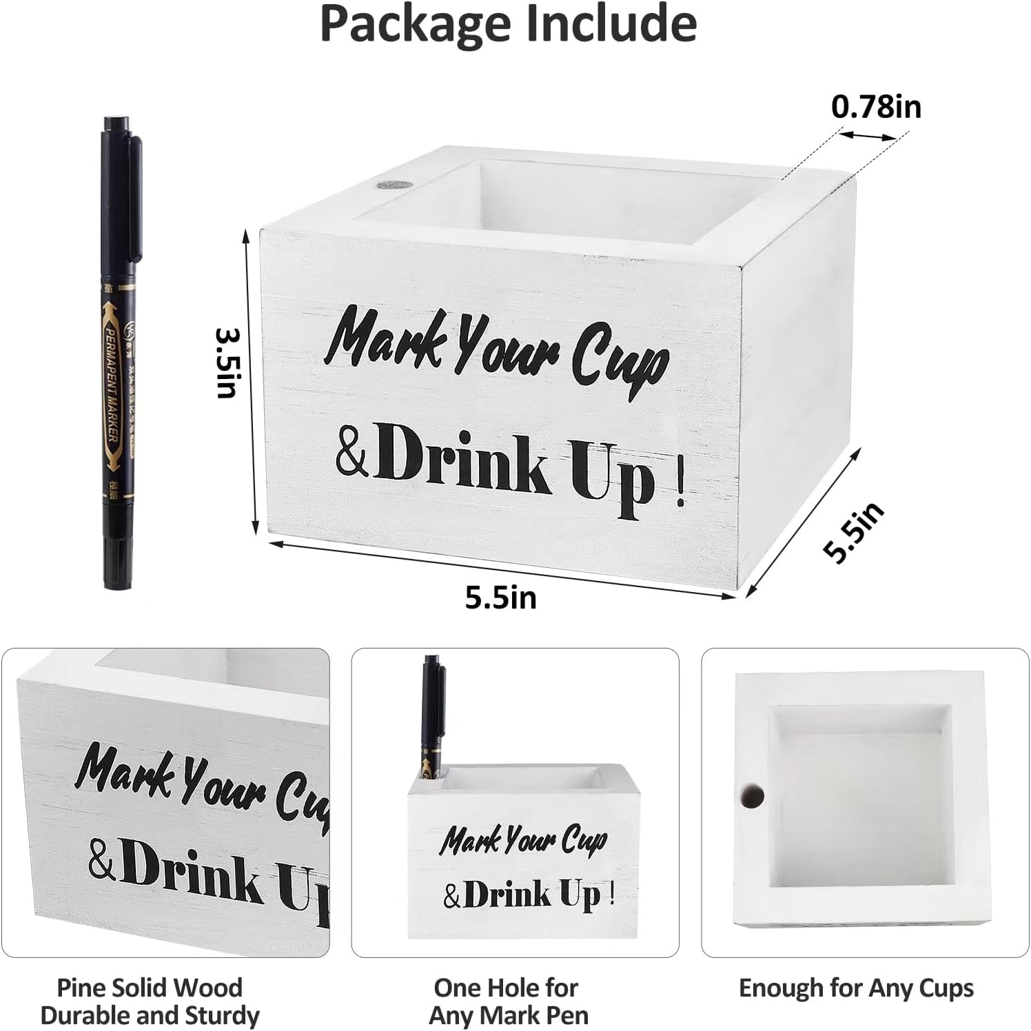 - 【Perfect Size For Party Cups】This wooden cup holder can accommodate most party cup sizes, including cups ranging in size from 10, 12, 16, and 18 ounces! Package included-You will receive a wooden white cup holder with a marker slot, printed with words-Mark Your Cup & Drink Up. And one marker pen. Use our party cup holder for the perfect addition to any party!