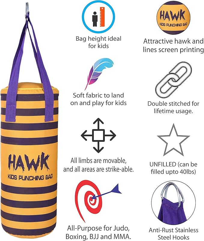 - ✅UNFILLED: The hawk kids punching bag comes UNFILLED and can be filled upto 30lbs with any of the following materials: Old clothes, towels, blankets, raw cotton, poly-fil or any other cotton filler material easily available from any of local store or amazon. NOTE: COMES UNFILLED!