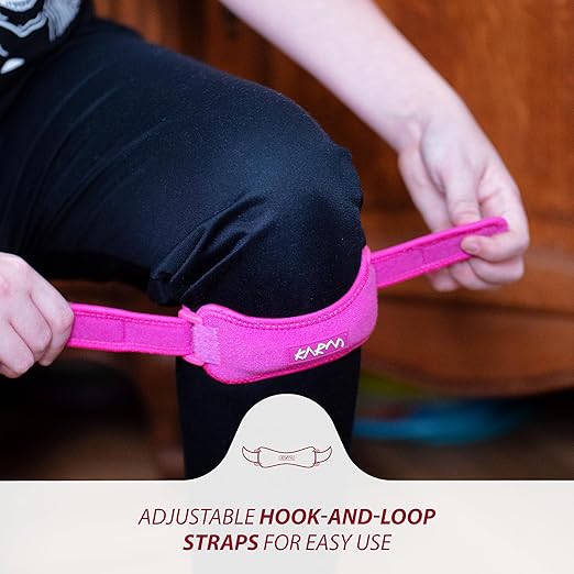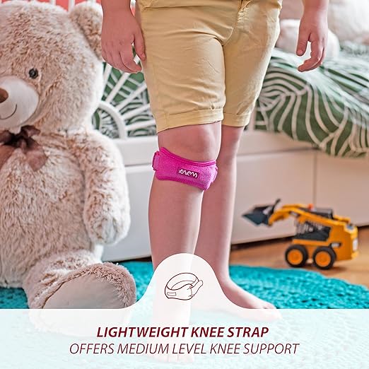 - Pink patellar tendon strap for kids offers medium-level support for the knee and helps to spread the pressure in the knee cap area without restricting the range of motion. Kids Patella Brace comes with 3 separate & different-length strap fasteners and thanks to the innovative product design, our knee support is suitable for 3-15-year-old children.
