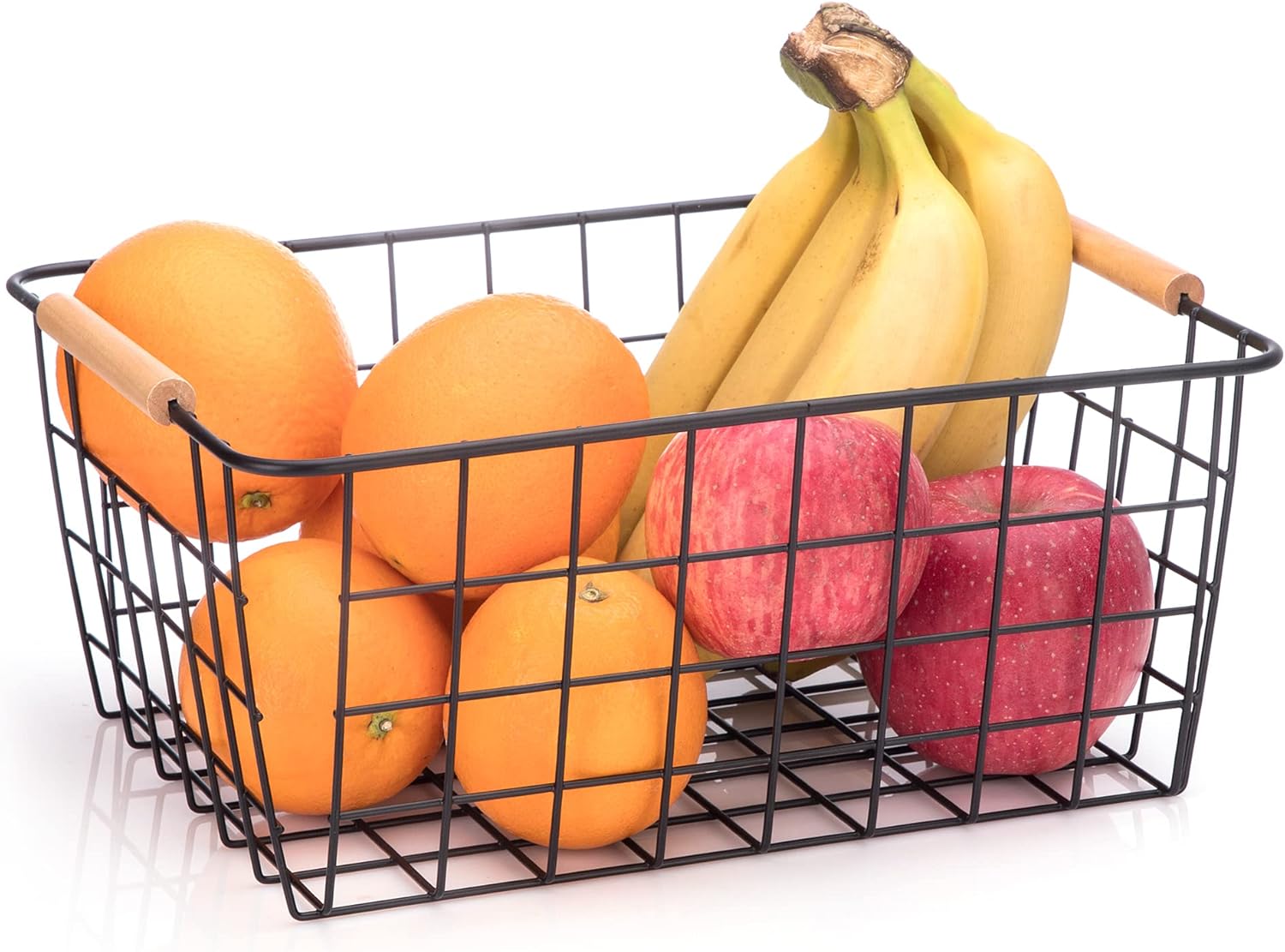 Metal Wire Food Storage Basket Organizer with Wooden Handles for Organizing pantry organizers and storage Kitchen Cabinets, 2 Packs-Black
