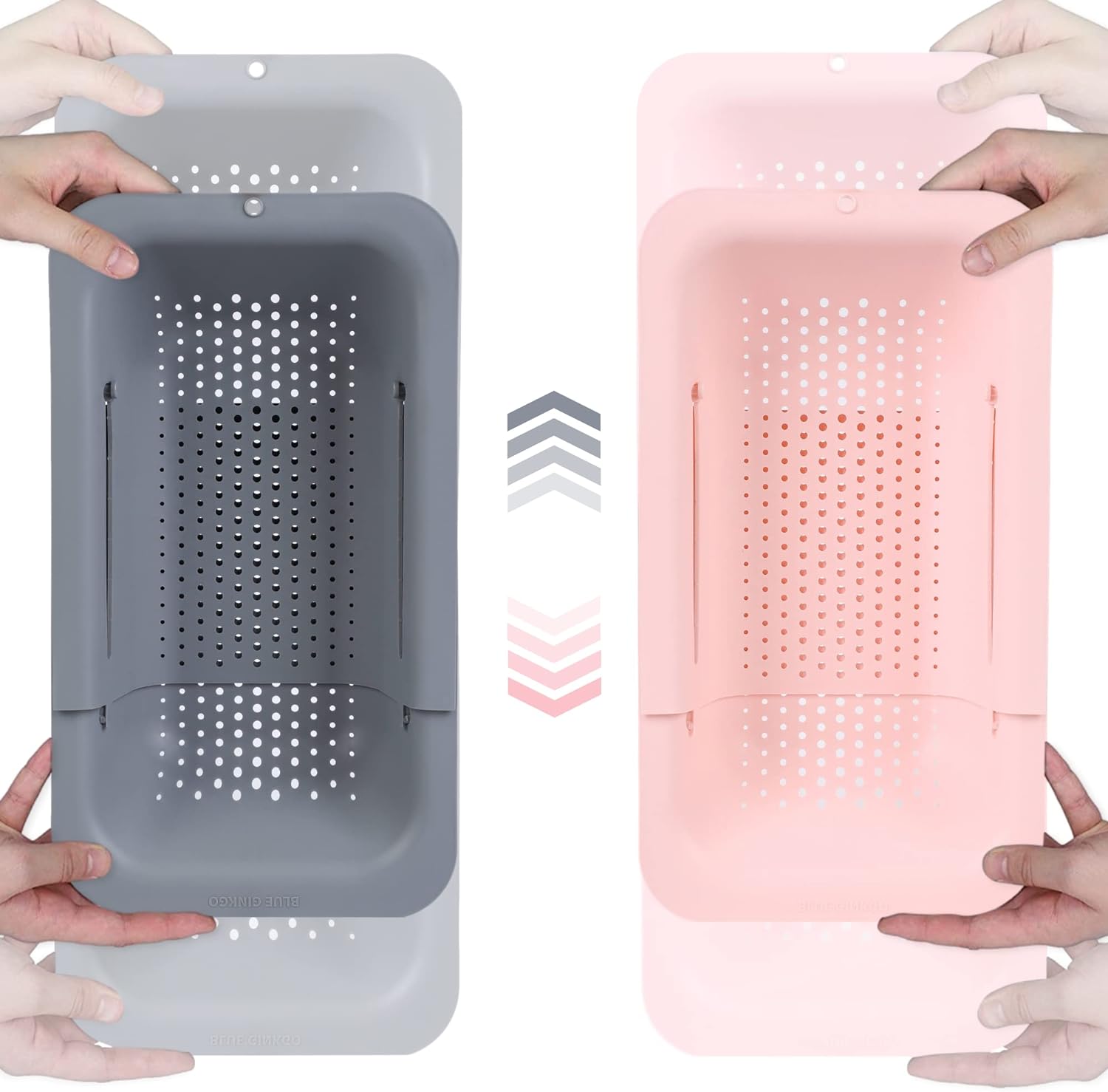 BLUE GINKGO Sink Colander Baskets - (Pack of 2) Wash Vegetables and Fruits, Drain Cooked Pasta and Dry Dishes - Extendable - New Home Kitchen Essentials (Grey & Pink)