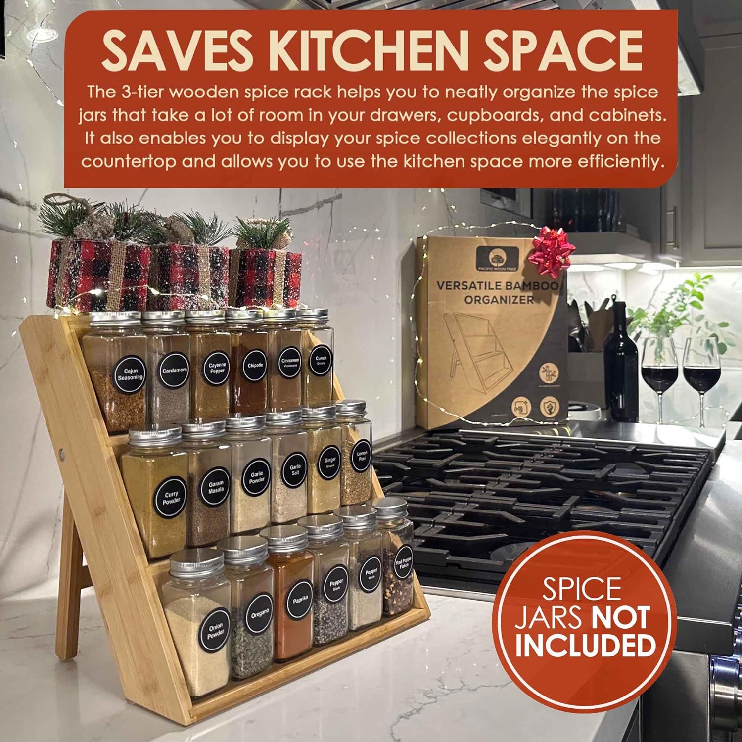 - 【SAVES KITCHEN SPACE】The 3-tier wooden spice racks free standing helps you to neatly organize the spice jars that take up a lot of room in your drawers, cupboards, and cabinets. It also enables you to display your spice collections elegantly on the countertop and allows you to use the kitchen space more efficiently
