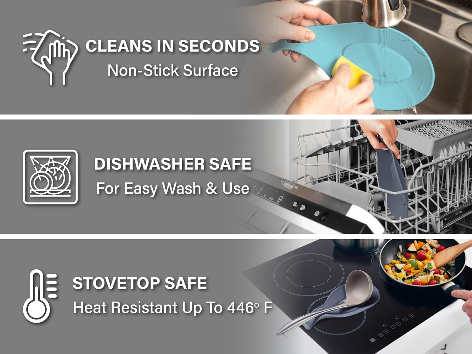 - EASY TO USE, EVEN EASIER TO CLEAN – Food residues and liquids slide off the non-stick silicone surface of our silicone spoon rest for kitchen counter in mere seconds. Simply rinse or wipe for quick cleanup (NO SCRUBBING NEEDED), or place in the dishwasher for a thorough cleaning (DISHWASHER SAFE).