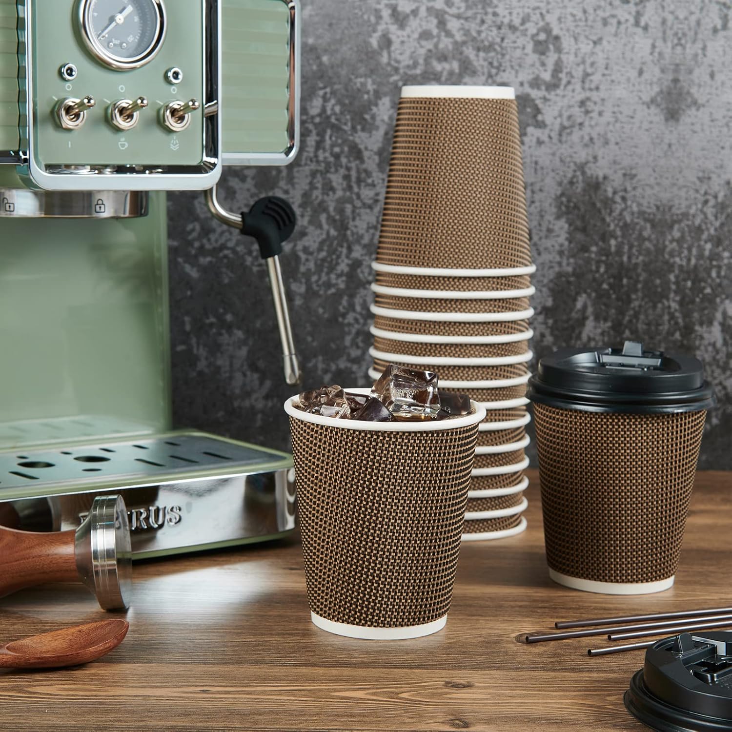 LITOPAK 80 Pack 10 oz Paper Coffee Cups, Insulated Ripple Wall Hot Coffee Cups with Lid and Straws, Brown Three Layer Insulated Hot Beverage Cups for Parties, Picnic, and Travel