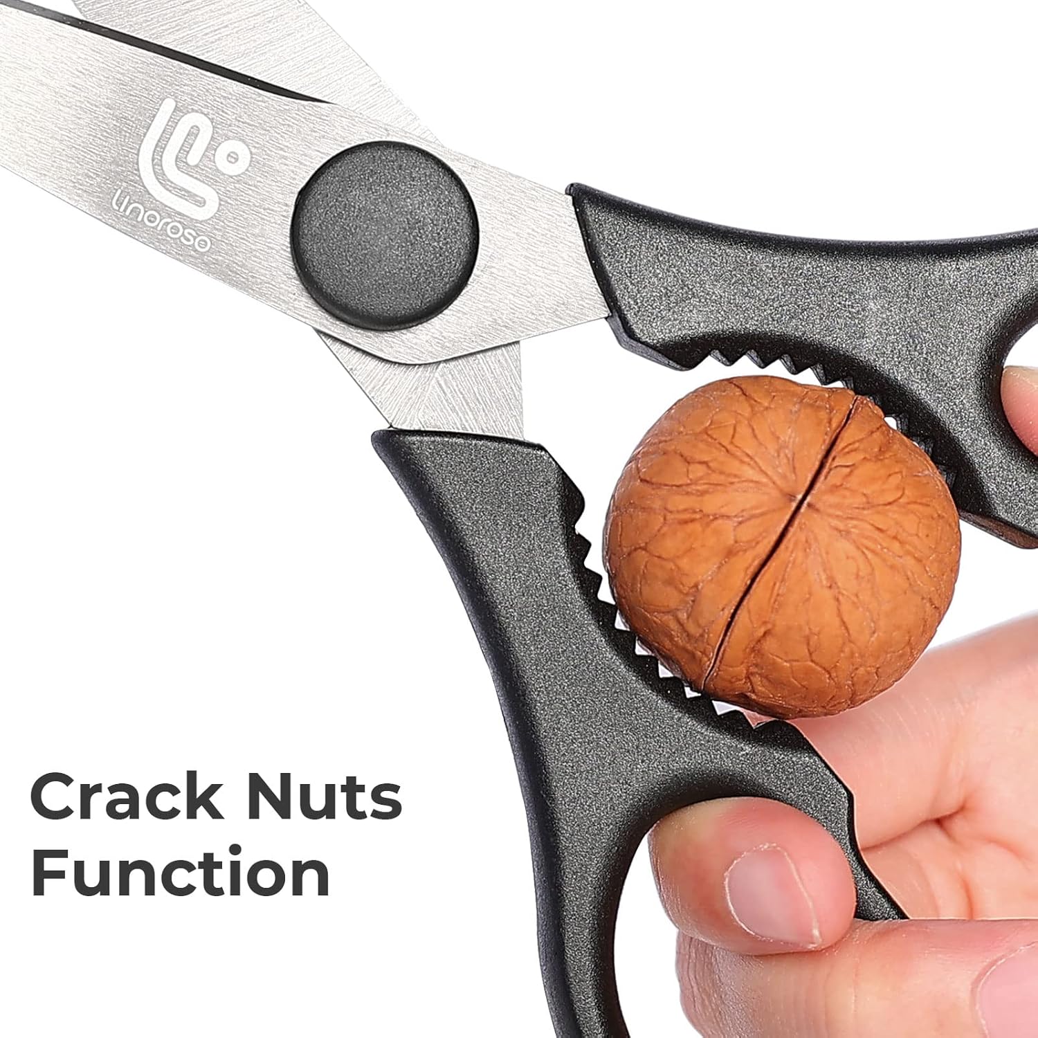 - Meaningful Additional Functions: As household black scissors, not just food scissors, high quality scissors blades are great for cutting burlap, paper, cardboard, flower stems, branch, food packing bag and more. Nylon teeth built in the handle can be used for opening bottles, herb stripper and crushing walnuts or nuts. Clever scissors grip for left or right handed and also suitable for outdoor BBQ and camping