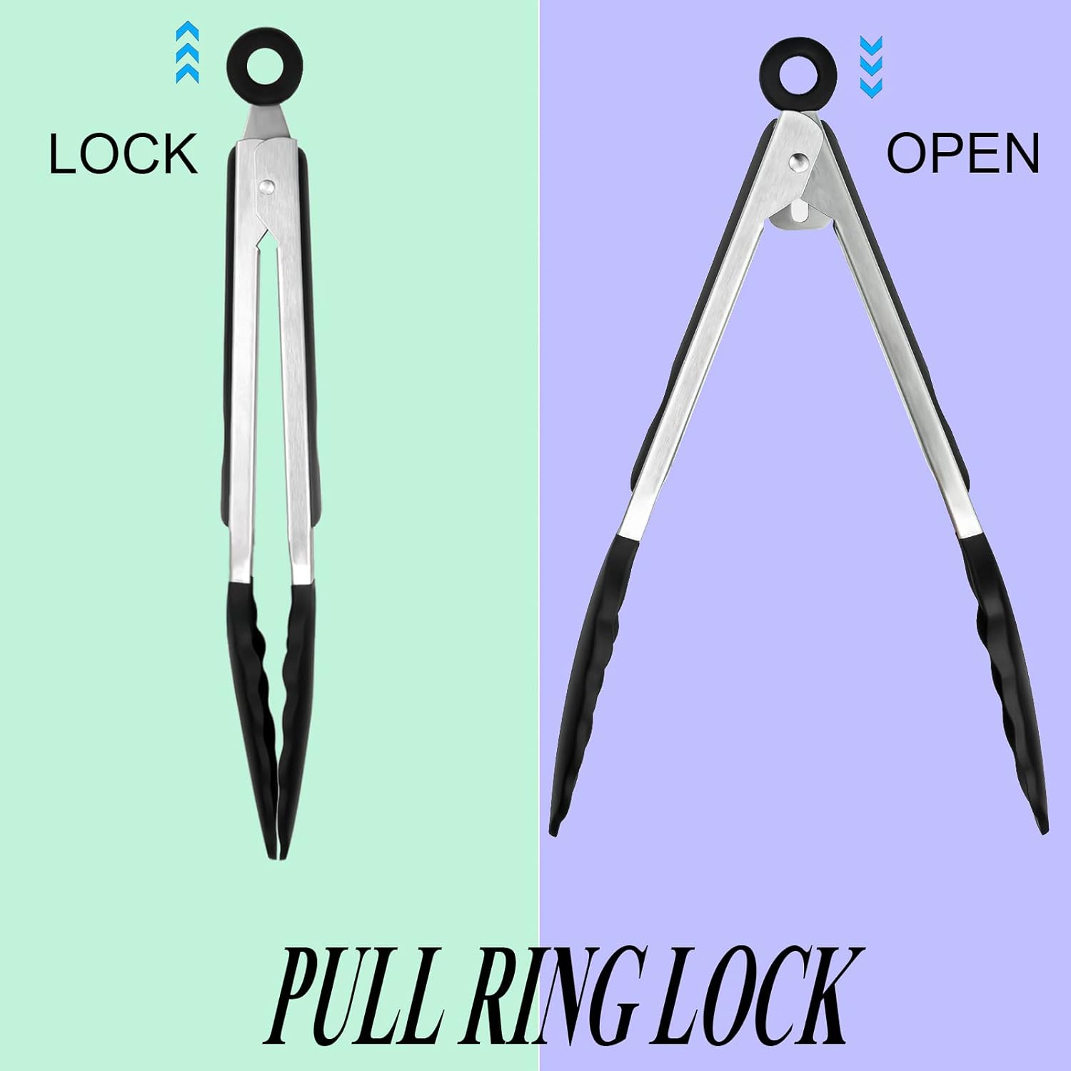 - EQUIPPED WITH PULL RING TECHNOLOGY: Our kitchen tongs are designed with a locking mechanism. The pull ring technology on the bottom prevents your tongs for cooking from opening or closing. Simply pull the pull ring to lock and press to unlock.