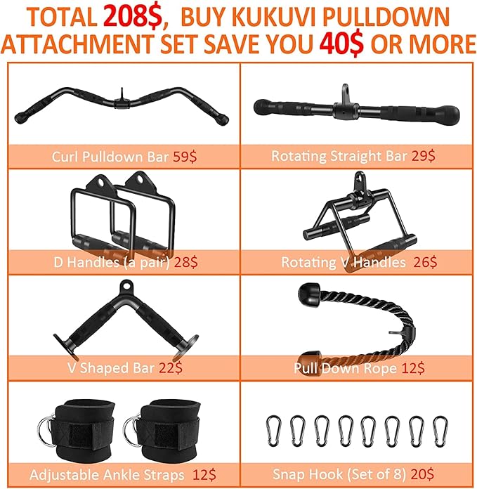 - Package Includes: 1*curl pull down bar, 1*triceps rope + 1*rotating v-shaped handle + 1*v shape press down bar + 1*rotating straight bar + 2*ankle straps + 2*d handles + 8*carabiner clips