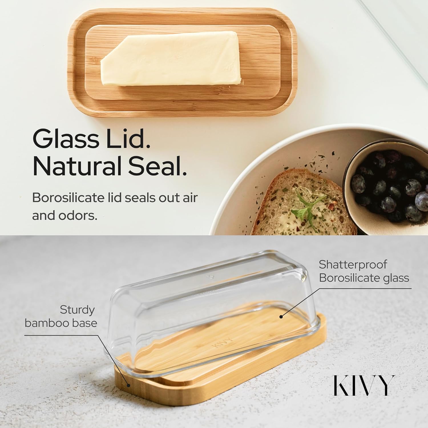 KIVY Glass butter dish with airtight lid that keeps butter soft - For countertop and refrigerator door shelf - Butter tray with lid fridge - Butter holder for counter - Covered butter dishes