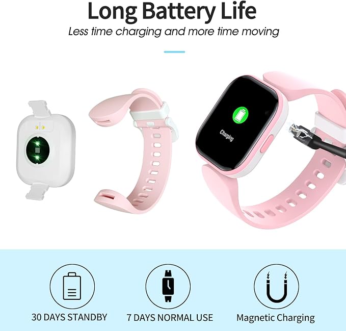 - 【Easy To Charge & Long Battery Life】Kids can charge the fitness watch very easy with the Magnetic charging cable. The fitness tracker takes only 2 hours to fully charge providing a 5-7 days battery life. which means kids can use it without worries of charging the tracker constantly, spend less time charging and more time palying.