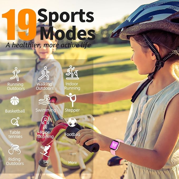 - 【Make Kids Fitness Fun and Build Healthy Habits】Multifunctional kids fitness watch with the function of Pedometer, Stopwatch, Heart rate monitor, Sleep monitor, Alarm clock, time display, Calories calculation, Music control, Remote Camera Shooting etc. 19 Sport modes, such as Walking, Running, Cycling, Swimming, etc. Sedentary reminder, Drink water reminder, Call /SMS /Message reminder, etc., IP68 waterproof, ready play in water.