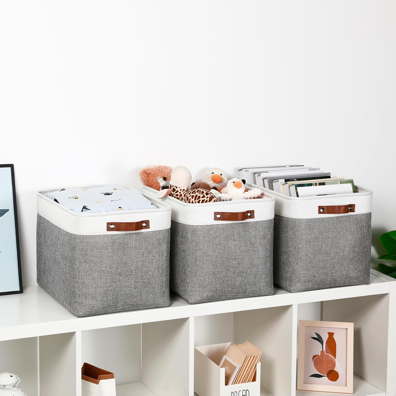 DULLEMELO Large Storage Baskets, Fabric Storage Basket with Leather Handles for Shelves Closet Nursery Toy Storage, Collapsible Fabric Baskets for Toy Book Magazine Towel Organizers(White&Gray)