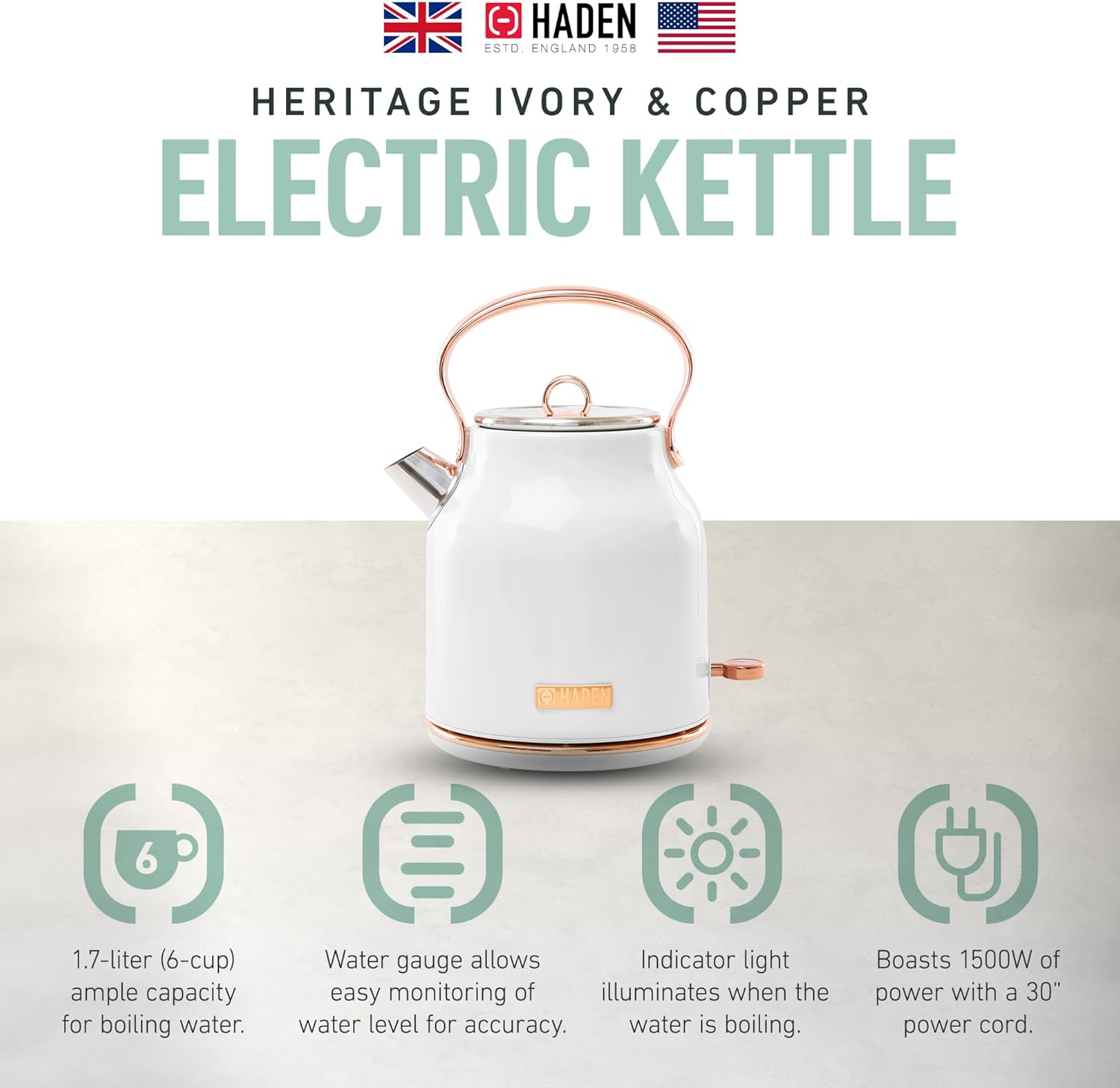 Haden Heritage 1.7 Liter Stainless Steel Electric Kettle, Hot Water Kettle with 360-Degree Base and Auto Shutoff, Ivory & Copper