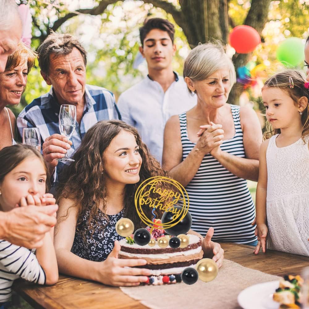 BEISHIDA Cake Topper Gold 27 Pack Cupcake Topper with Mini Balls, Happy Birthday Acrylic Toppers, Cake Decorations with Insert Pick DIY for Anniversary Wedding Baby Shower Party(Gold/Black)
