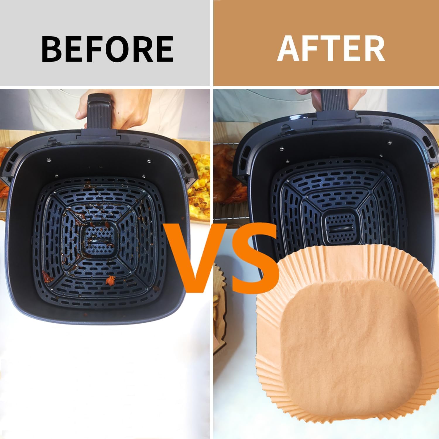 - ♡ include 100PCS Large 9.0inch Square Air Fryer Disposable Paper Liner,wax paper sheets for food Thickened Natural Baking Parchment Paper Airfryer liners,high quality air fryer parchment paper liners 9.0in*9.0in*1.77in,Fits 9.0''-10.5'' Air Fryers brown parchment paper, due to manual measurement, there may be a deviation of 0.5-1 inch (approximately 1.3-2.5 cm), fit most air fryers.
