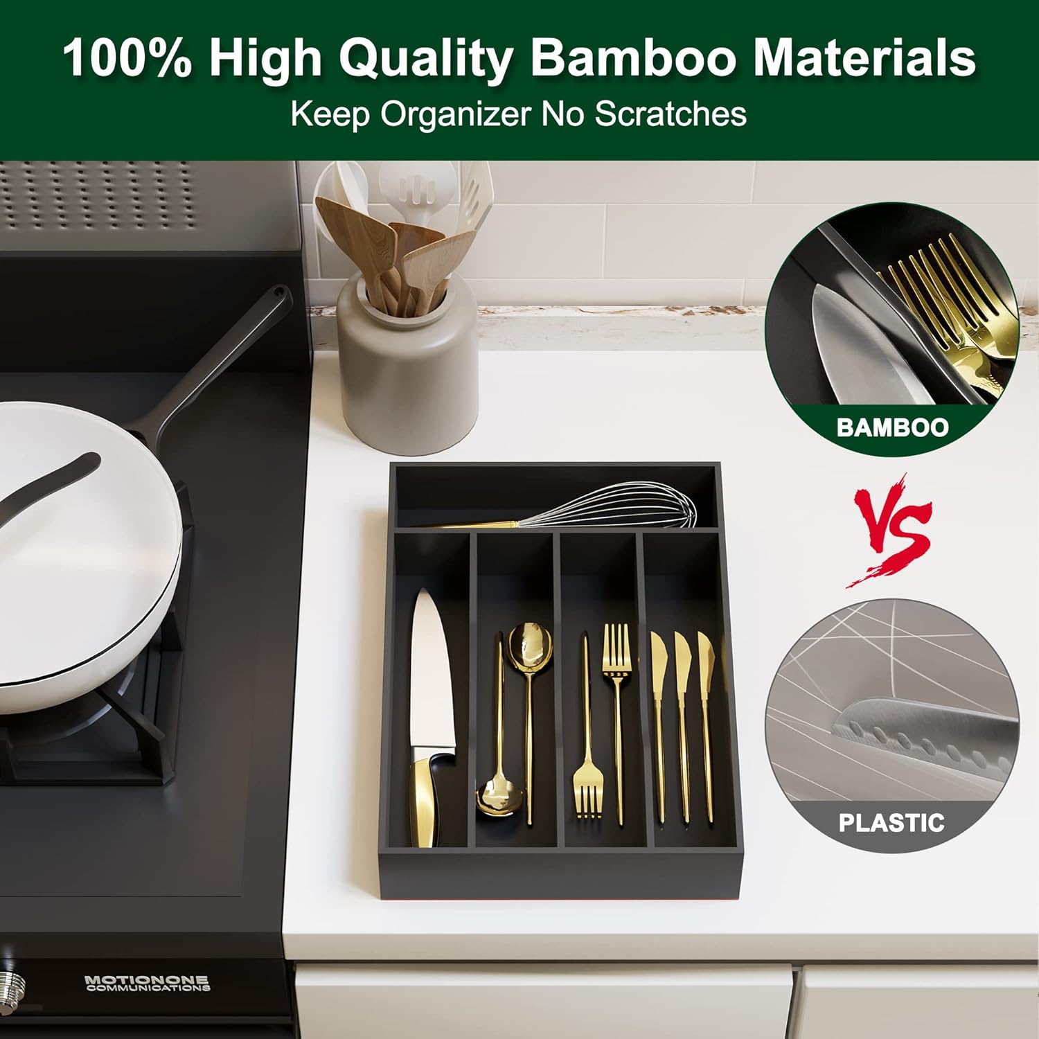 - 【Made of natural bamboo】Our flatware organizer is made of natural bamboo. The material is taken from bamboo that have grown for more than 4 years which make our silverware holder for drawer use a durable kitchen piece that ll last you for years. The Environmentally material keep our flatware & utensil water and odor resistant. Even the knife won't leave scratch on it.