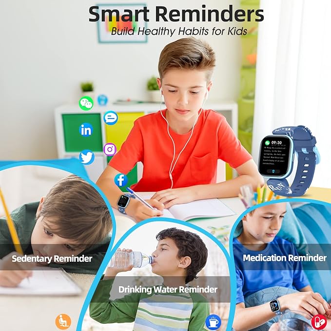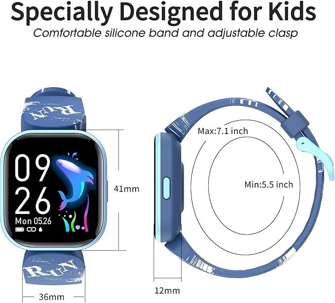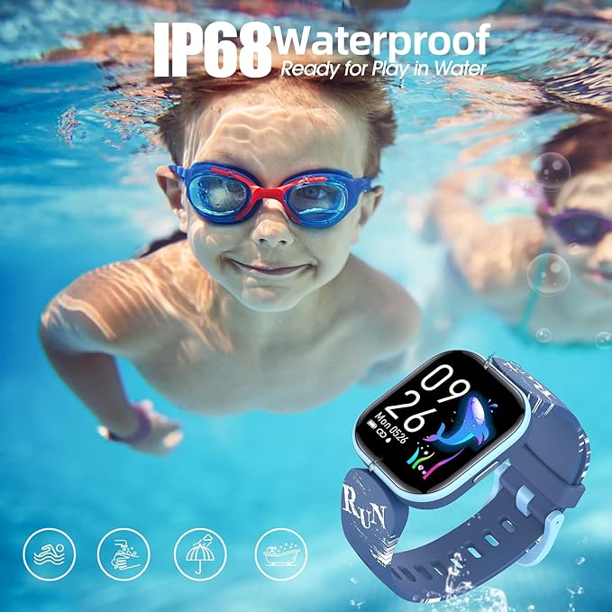 - 【Make Kids Fitness Fun and Build Healthy Habits】Multifunctional kids fitness watch with the function of Pedometer, Stopwatch, Heart rate monitor, Sleep monitor, Alarm clock, time display, Calories calculation, Music control, Remote Camera Shooting etc. 19 Sport modes, such as Walking, Running, Cycling, Swimming, etc. Sedentary reminder, Drink water reminder, Call /SMS /Message reminder, etc., IP68 waterproof, ready play in water.