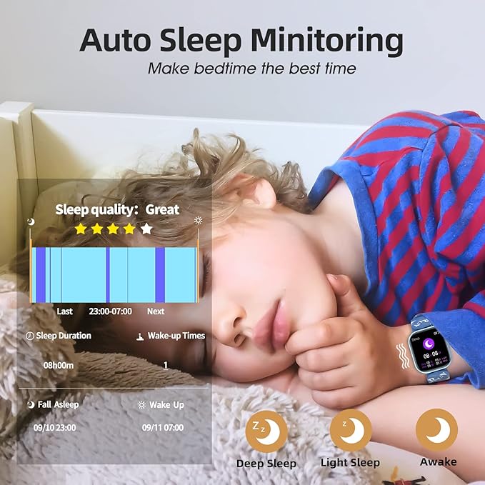 - 【Automatic Sleep Tracking】The kids activity watch can automatically track how well your kids sleep at night. Get the data about your kids sleeping trends through the night via the “H Band” app.The vibrating alarm clock can wake up your kids without disturbing others, helping kids form a good sleep habit.