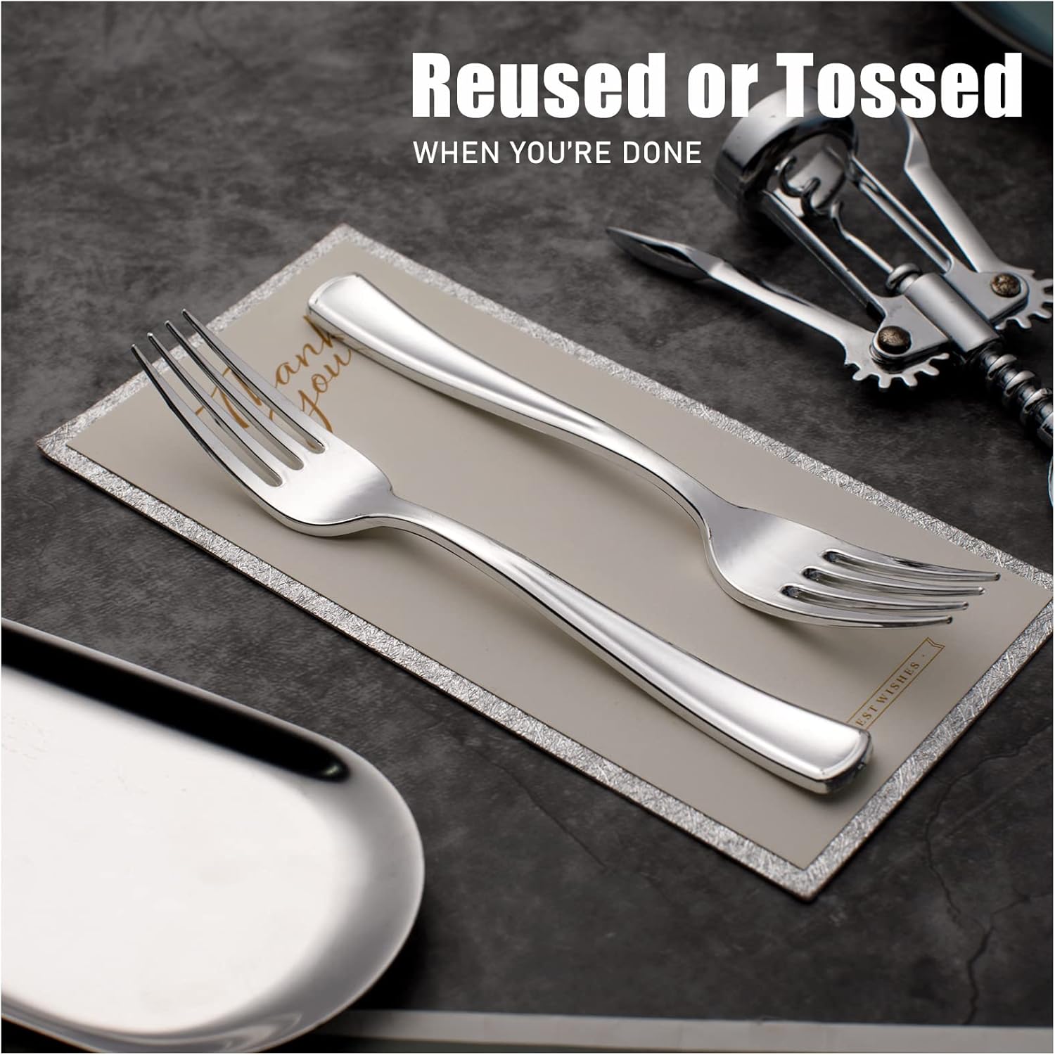- THE VALUE SET: There are 100 plastic forks that you will never run out of! You can throw away when you're done. If you're willing to hand wash these disposable silver forks, you'll be able to reuse these silver disposable forks at your next party