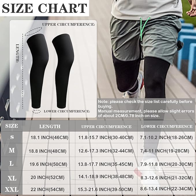 - Anti-slip Design UV Protection:Our long leg sleeves with 2 non slip silicone waveband and elastic compression straps on the top,which can keep the position well, not easy to fall off, helping you enjoy the sports time.Leg sleeves can also with UV protection,protect your leg from the harmful sun,keep you in the sports and protected at all times.They are practical and considerate.