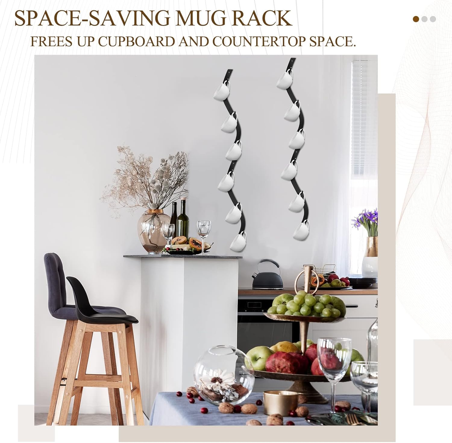 - Eye Catching Wave Design: the coffee mug rack is designed into curve shaped, you can use the wall space reasonably, making the cups neat and orderly without wasting time to find the cups and keeping cups at your fingertips and protecting them from breakage