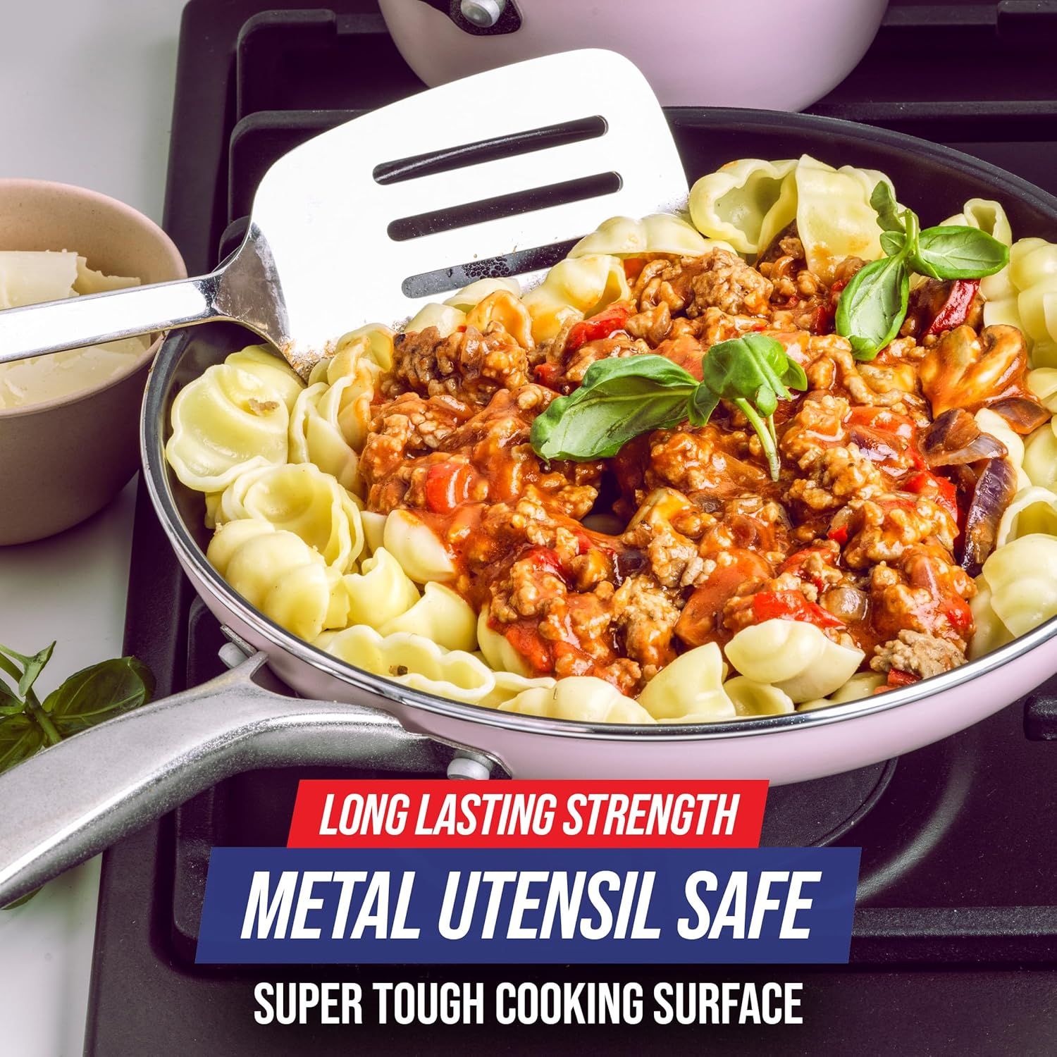 - DIAMOND-TOUGH EXCELLENCE: Metal utensil safe surface with diamond-infused ceramic nonstick - 5x harder and 10x longer lasting than traditional coatings. Tough enough for your toughest recipes!