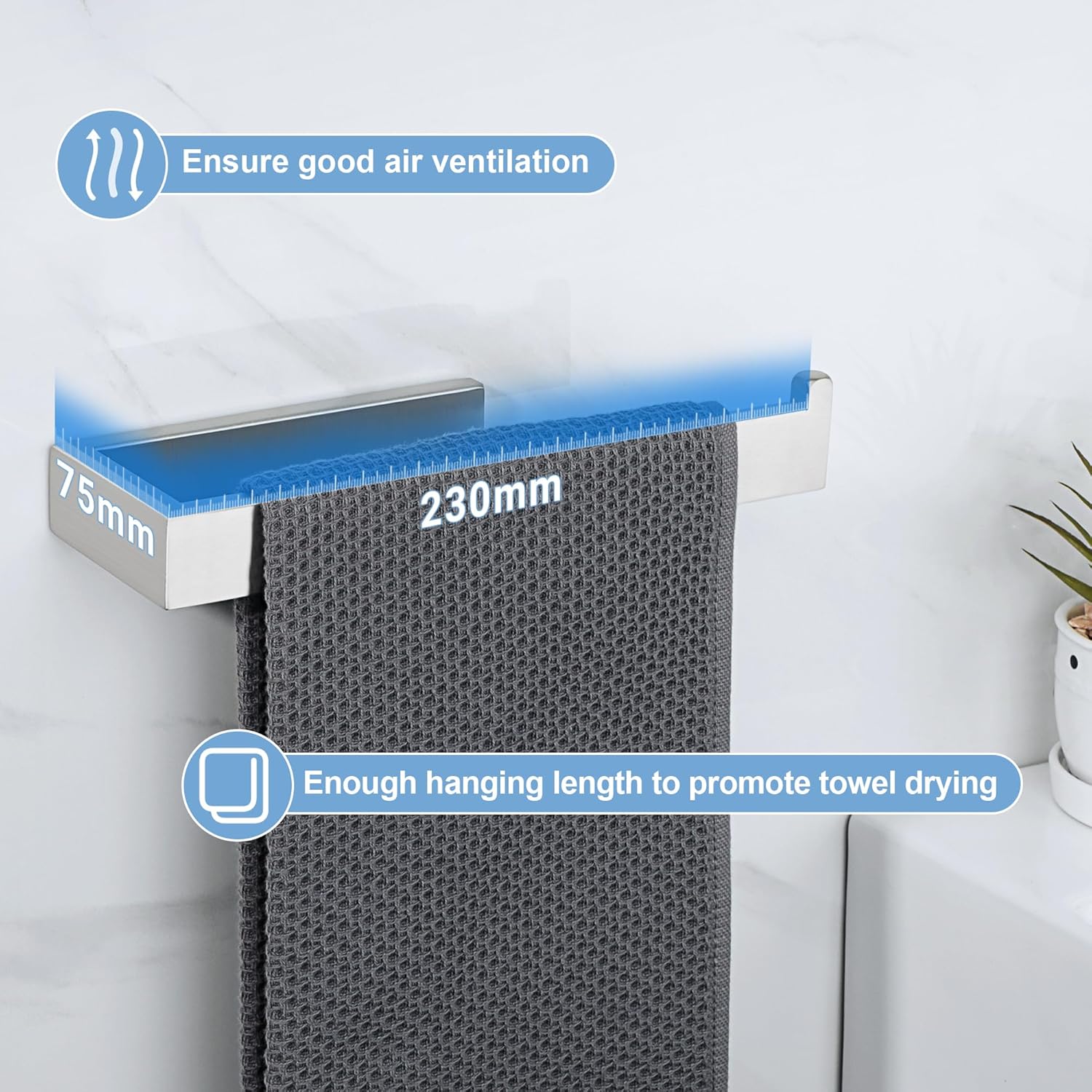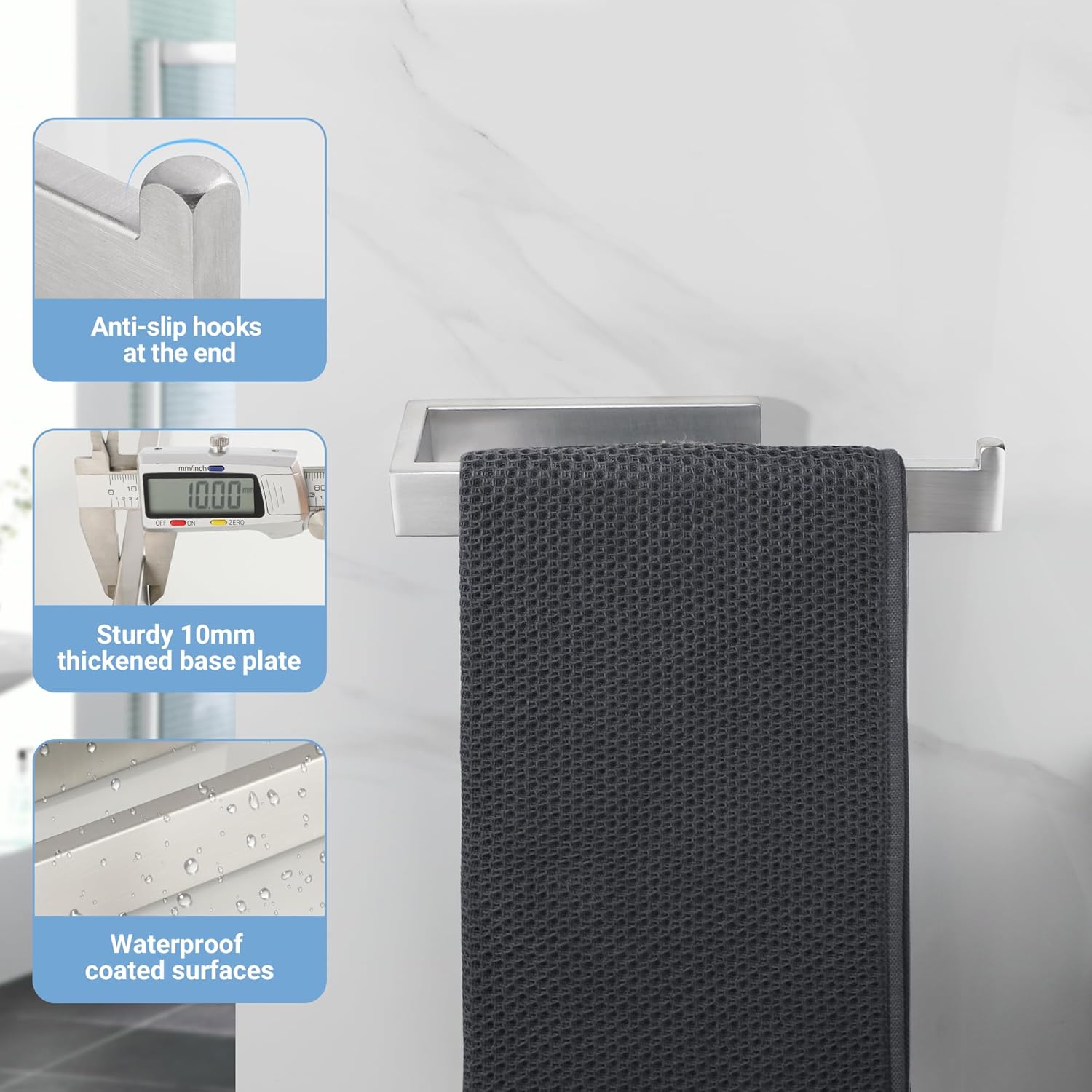 - 10 INCH TOWEL BAR - The overall length of the hand towel bar for bathroom is 9.45". The length of hanging space is 8.6" and the maximum load is 17.6 lbs. 2.18 inches apart from the wall for quick and thorough air drying.