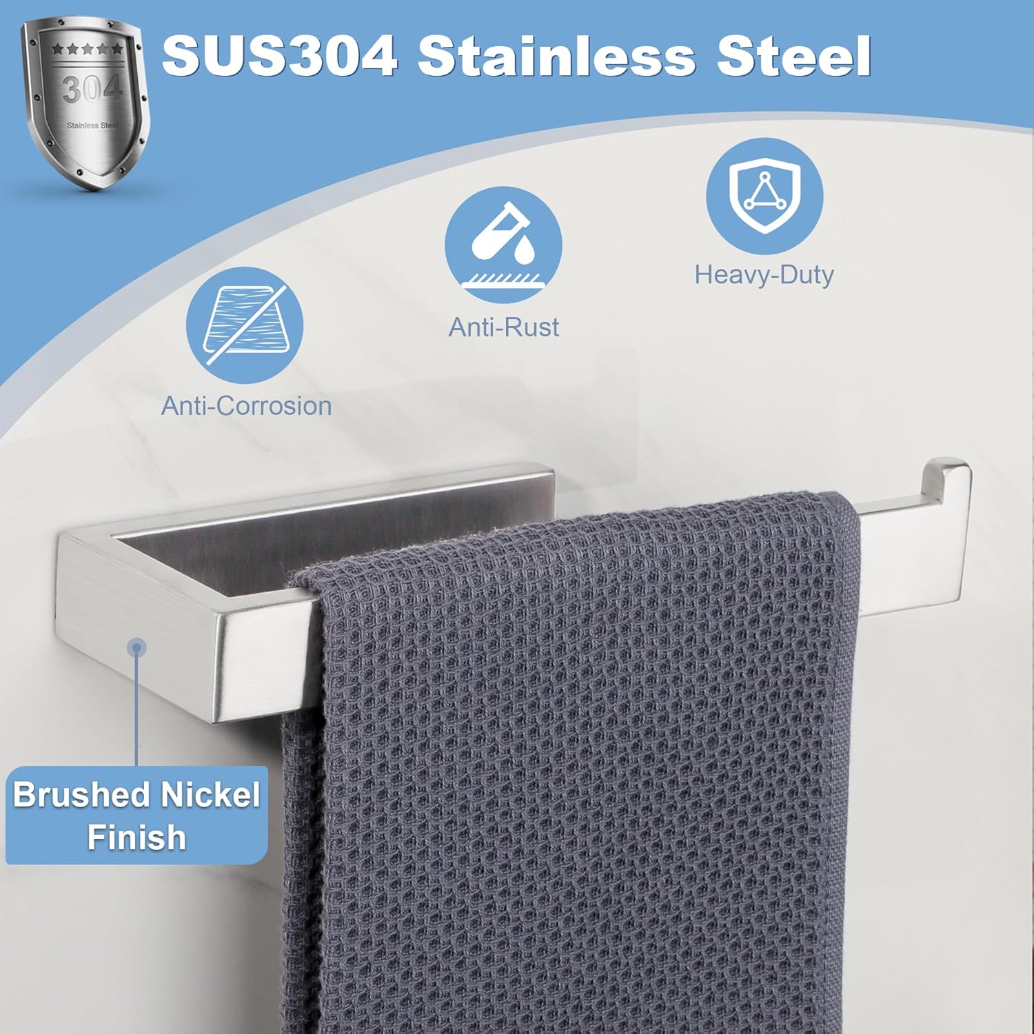 - WIDE APPLICATION - Perfect for shower, bathroom, kitchen, laundry room, cabinets, wash basins, etc. Please note, the brushed nickel towel bar can only be fixed by drilling, not by pasting.