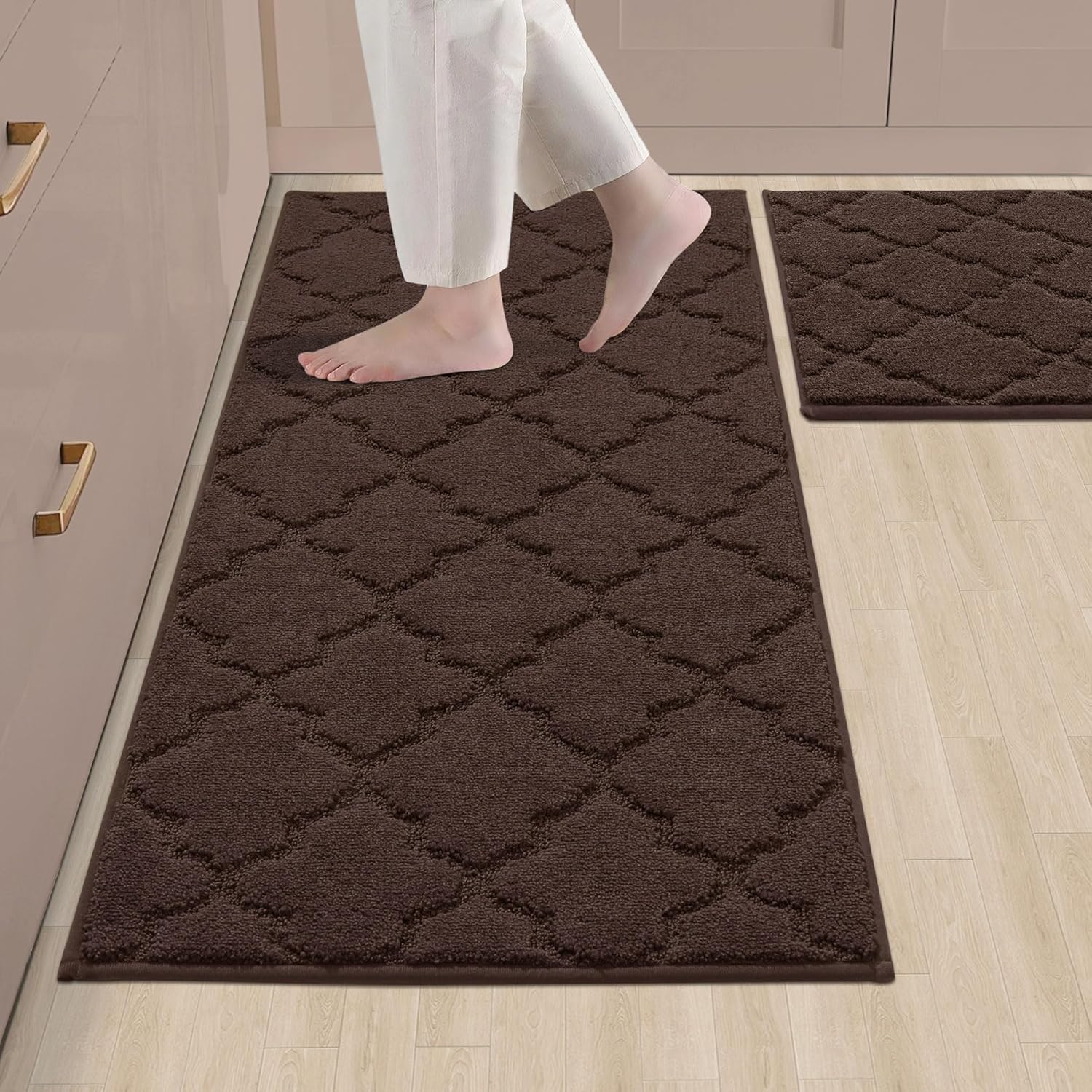 COSY HOMEER Soft Kitchen Rugs [2 PCS] for in Front of Sink Super Absorbent Kitchen Floor Mats and Mats 20x30 Inch/20X48 Non-Skid Kitchen Mat Standing Mat Washable,Polyester,Brown