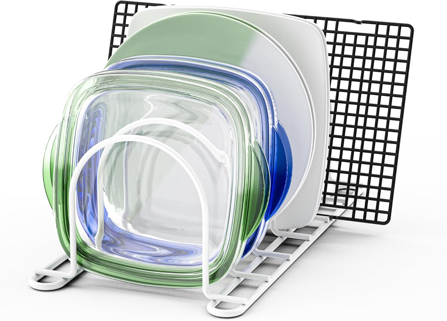 - √ 【Keep your cabinets well-organized 】The plate rack can store your pots lid,cutting board, cookie sheets , pans , bakeware , file folders,reusable bags and bee wraps orderly