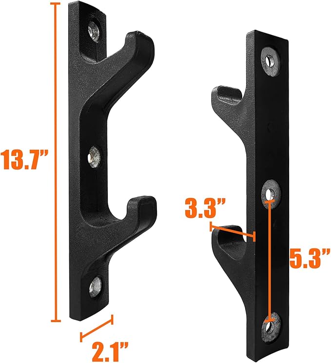 - Wall Mount Barbell Rack - Including all accessories to attach on wall, keep your bars well organized. Size 13.85L x 2.15W in, screw hole diameter 0.5 in, distance between double holes 5.3 in, 1 pair weight 7.67 bl