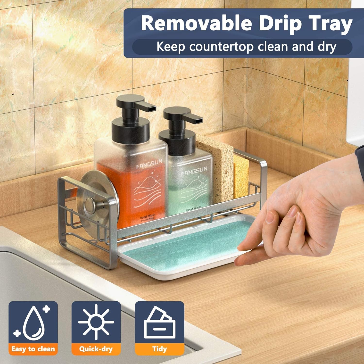 FANGSUN Large Sponge Holder for Kitchen Sink, 304 Stainless Steel Sink Caddy Organizer with Removable Drip Tray, Kitchen Countertop Dish Soap Holder, Not Include Soap Dispenser, Grey