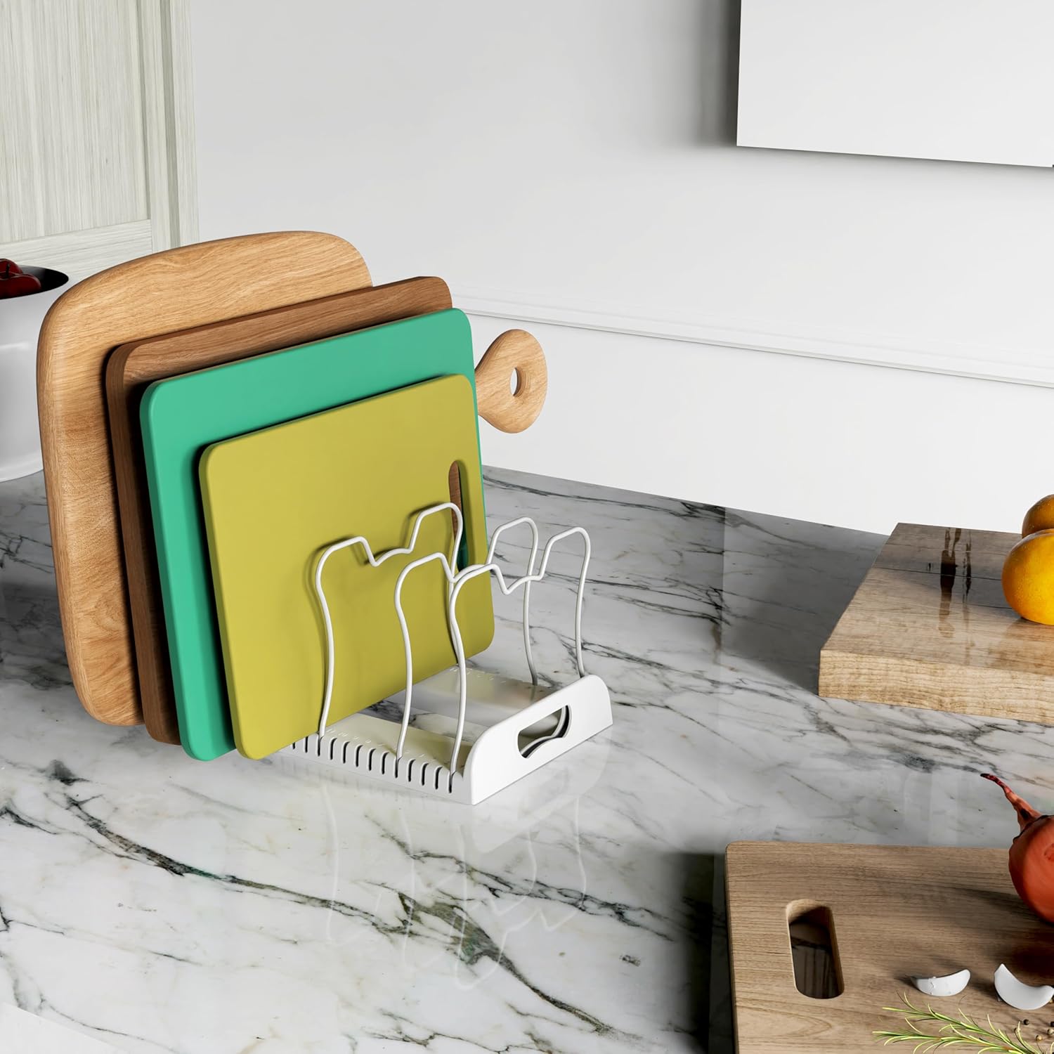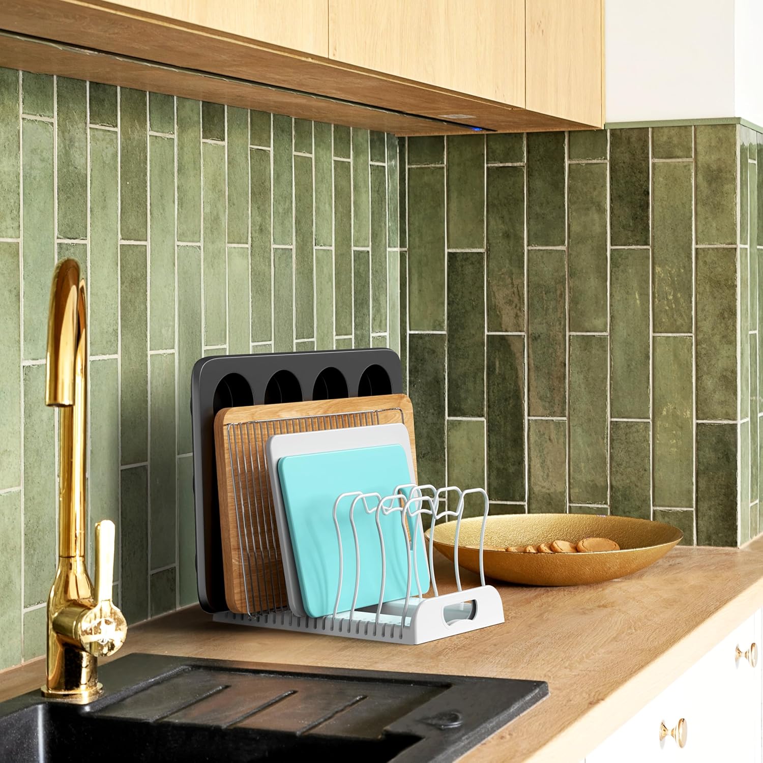 - Organize pans, pot lids, platters, cake molds, cutting boards ccokware and bakeware in the cabinets, counter top or pantry.