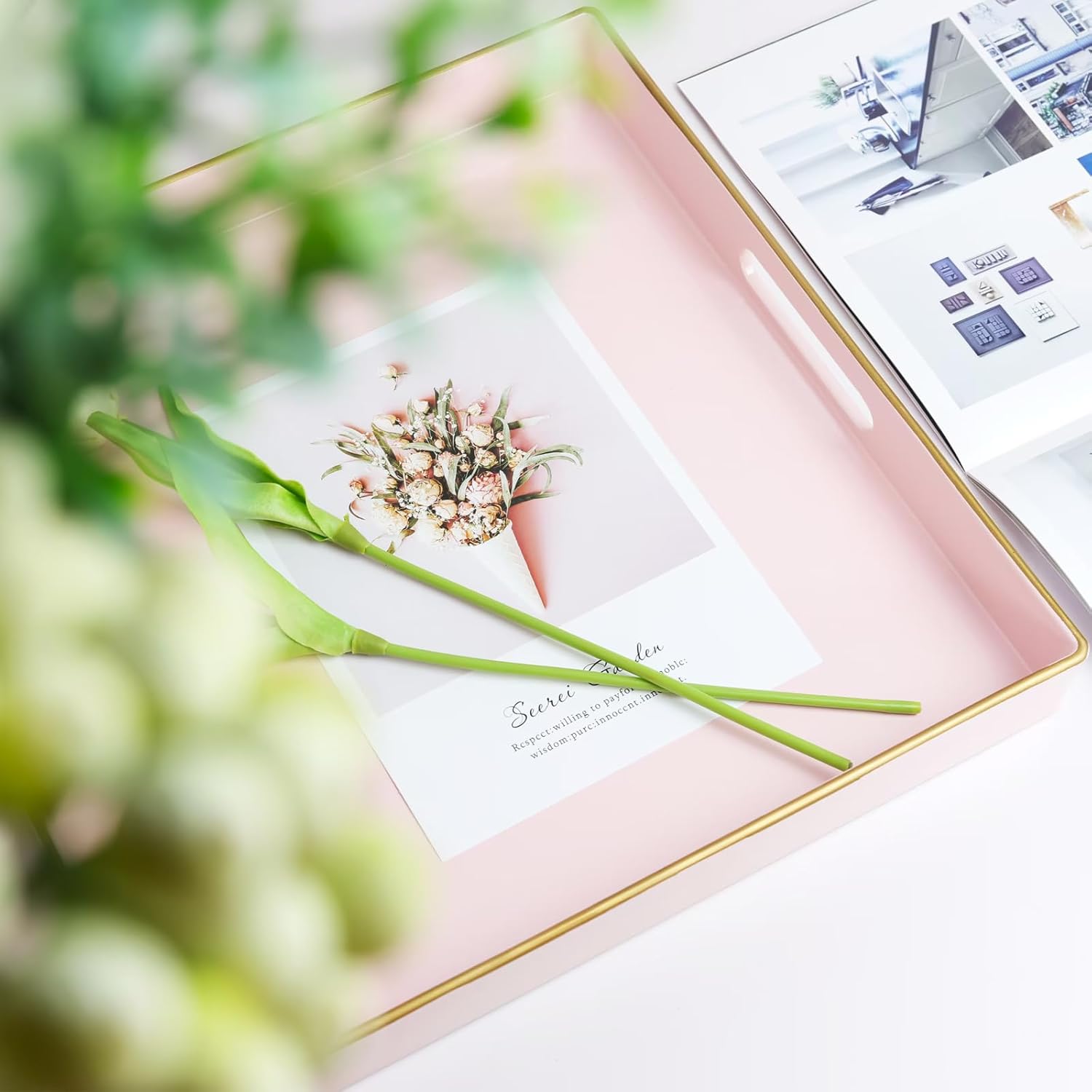 Spsyrine Pink Decorative Serving Tray with Handles, 13" X 13" Square Plastic Coffee Table Tray for Ottoman, Living Room, Bathroom, Home Decor.