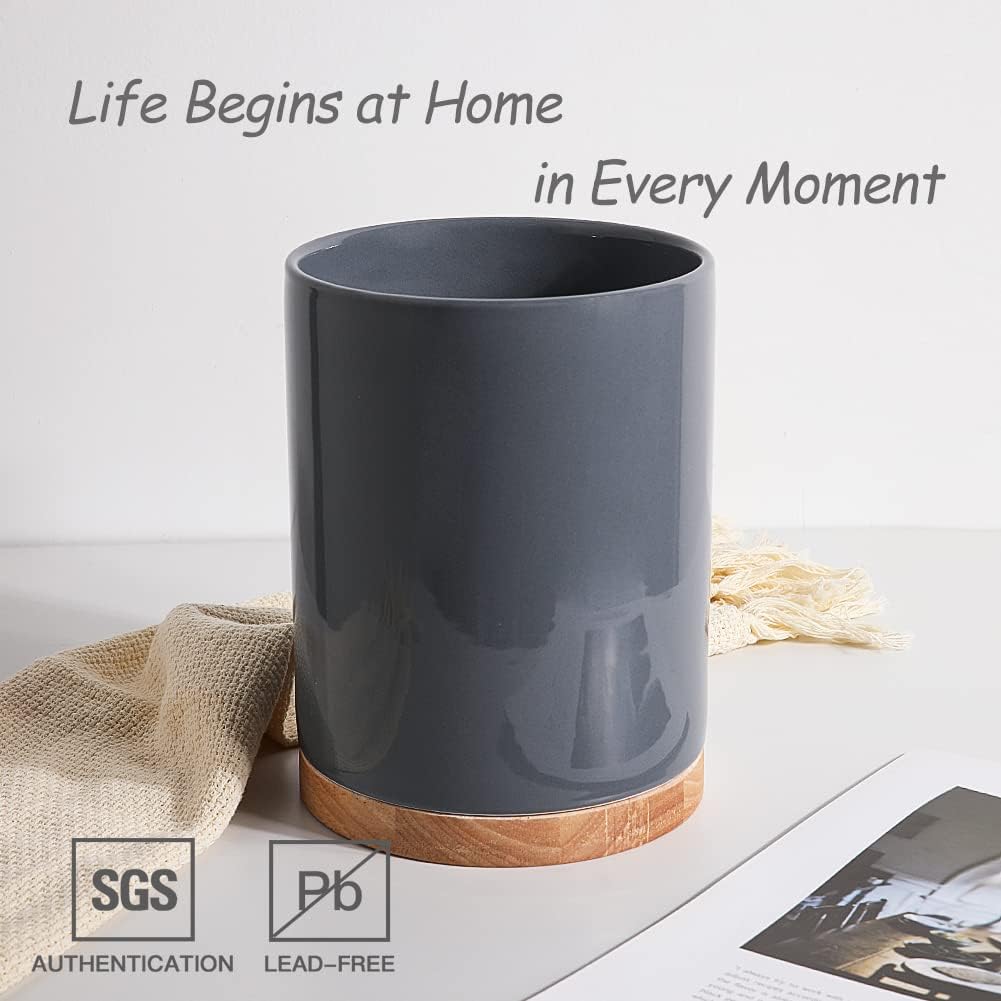 Sweejar Kitchen Utensil Holder with Wooden Bottom, 8.2" Ceramic Utensil Crock to Hold Spatulas for Cooking Countertop, Housewarming, Wedding, Birthday Gift (Gray)