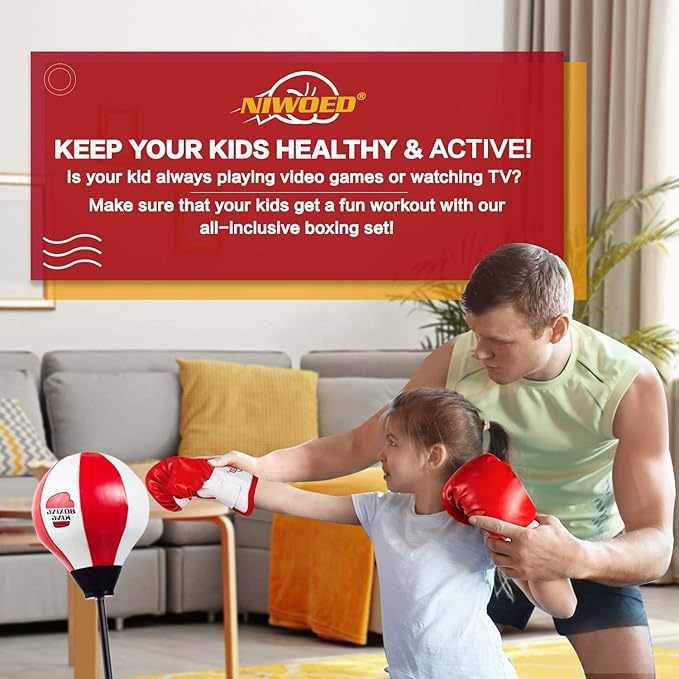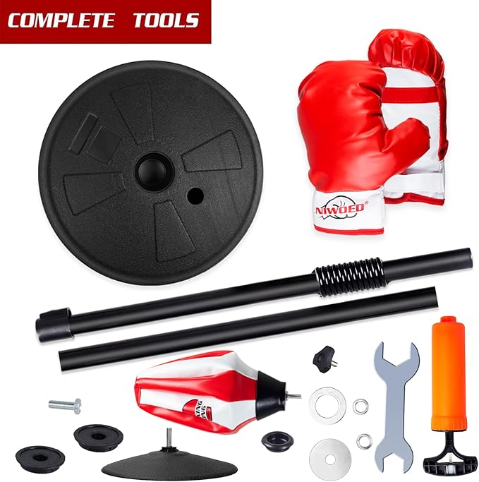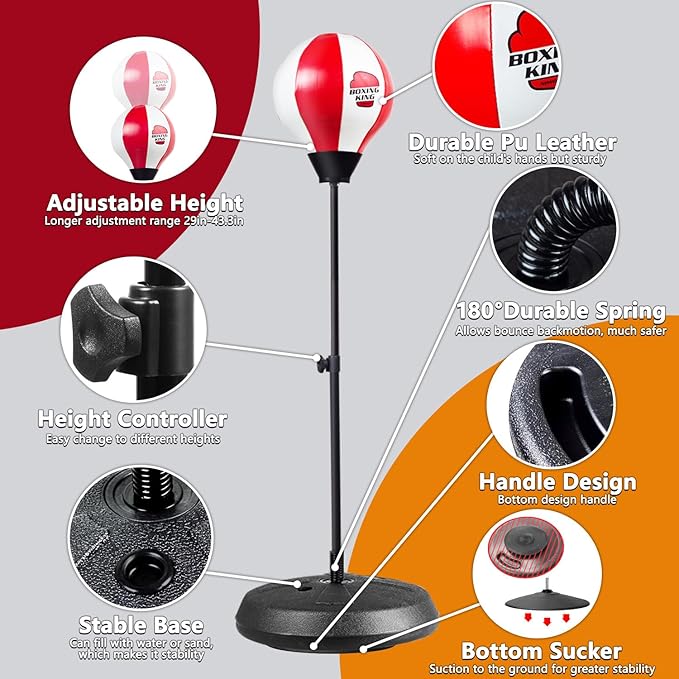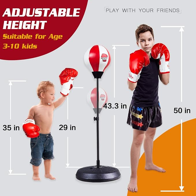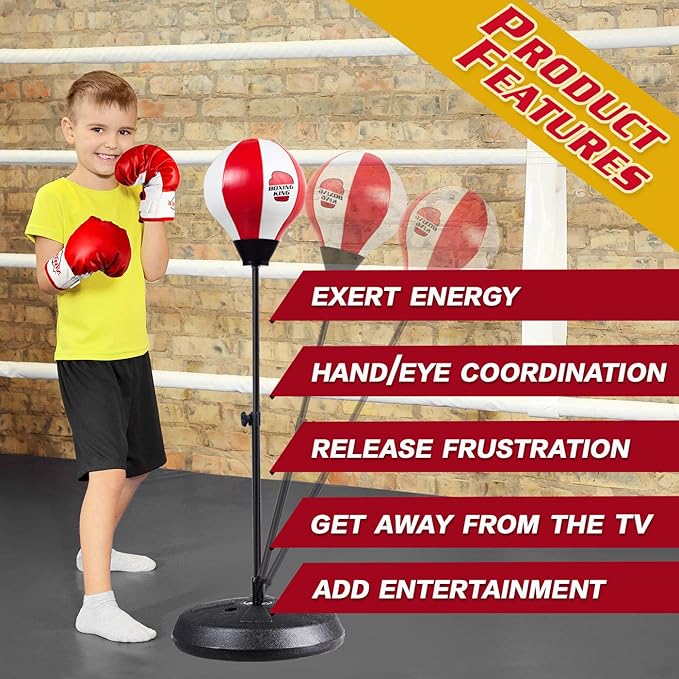 - Kids Punching Bag Set:This portable punching toys set with stand can release energy of your growing kids,which is modelled on pro boxing equipment,is the best boxing enlightenment toy for kids.Wearing boxing gloves,staring on punching ball,straight punching,hitting hard like a boxing king in the TV!