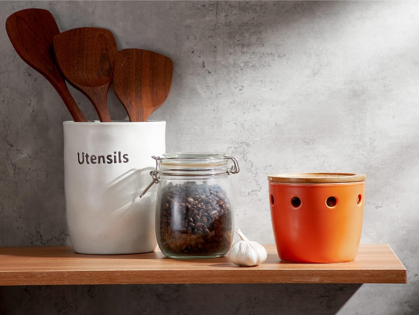 ONEMORE Large Garlic Keeper with Lid, Ceramic Garlic Saver 5 inch, Garlic Keeper for Counter, Orange