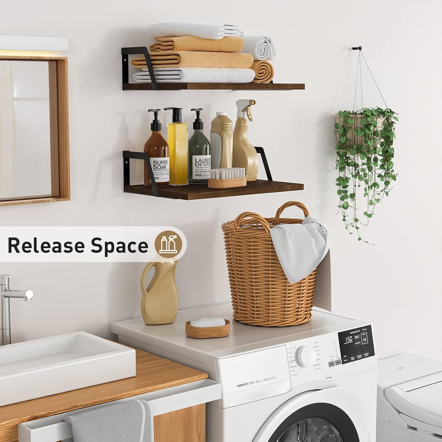 - Functional Wall Shelves: Versatile wood shelves allow you to exhibit photos or plants in the living room, hold beauty products in the bathroom , or hold spices and jars in the kitchen.