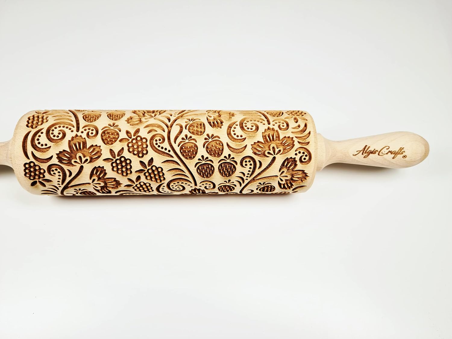 STRAWBERRY embossing rolling pin. Engraved wooden embossed dough roller for embossed cookies or clay by Algis Crafts