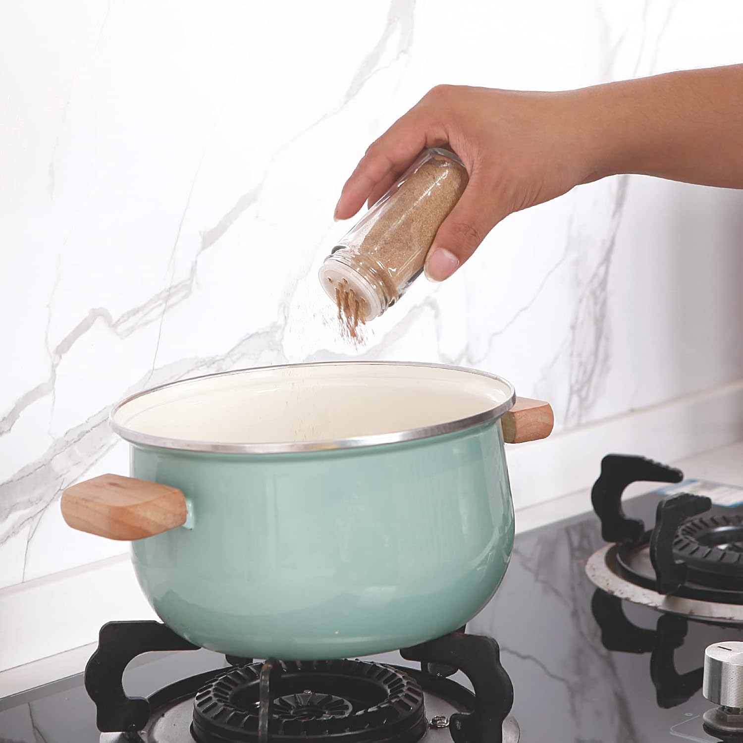 - SQUARE SPICE BOTTLES - 6 clear glass spice jars are ready for your favorite spices! Organize your kitchen cupboards and spice racks using our seasoning containers.The lid of the spice jars is protected by a bright blue film( peelable ).