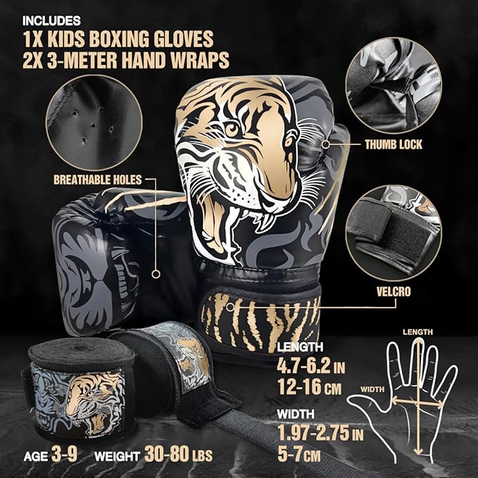 - Just Right for Your Size — This boxing gloves for kids from 30 to 90 lbs (or 14 - 40 kg). Ages 3 - 9 years old. Included 1x Kids boxing gloves, 2x 3-meter hand wraps.