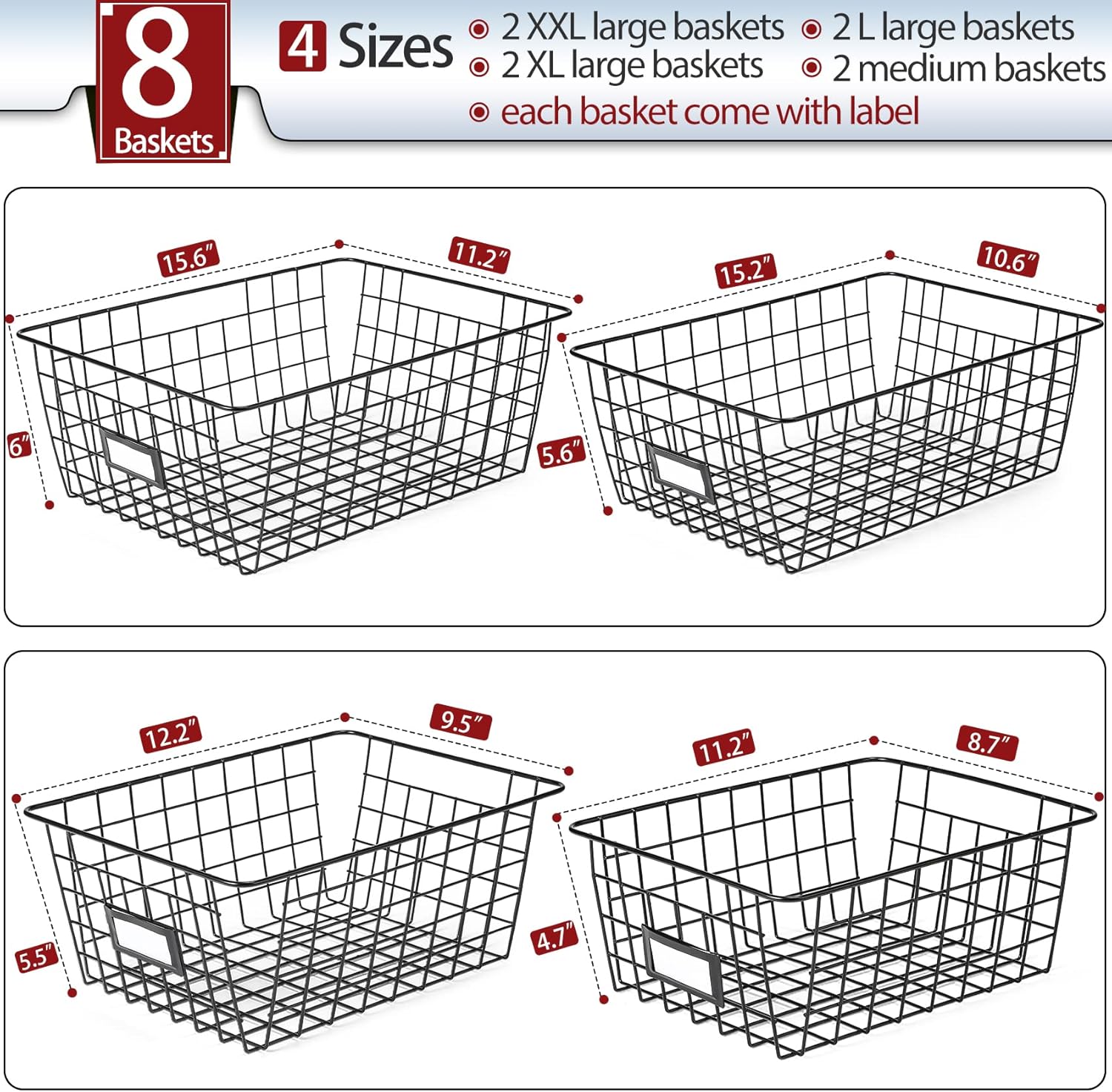 - 8 BASKETS, 4 SIZES - The 8 metal wire baskets come with 4 different sizes - 2 XXlarge, 2 Xlarge, 2 Large and 2 Medium. XXlarge - 15.6"(L) x 11.2"(W) x 6"(H). Xlarge - 15.2"(L) x 10.6"(W) x 5.6"(H). Large - 12.2"(L) x 9.5"(W) x 5.5"(H). Medium - 11.2"(L) x 8.7"(W) x 4.7"(H). You can use different sizes for different purposes.