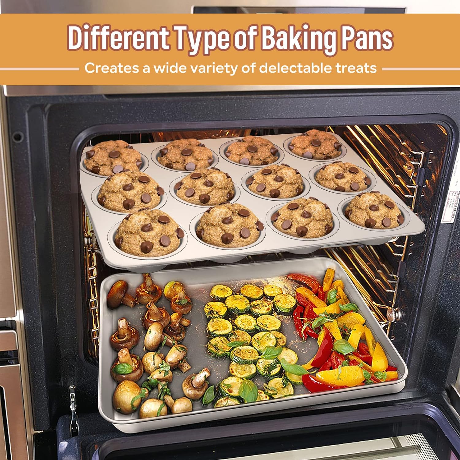 - VERSATILE BAKING PANS - Different baking pans creates a wide variety of delectable treats - from cookies and muffins, cupcakes, loaves, pizza to roasting chicken, vegetable, beef etc, Well fit in oven and stack up together easily to save storage space, Idea gift for Christmas, Thanksgiving Day