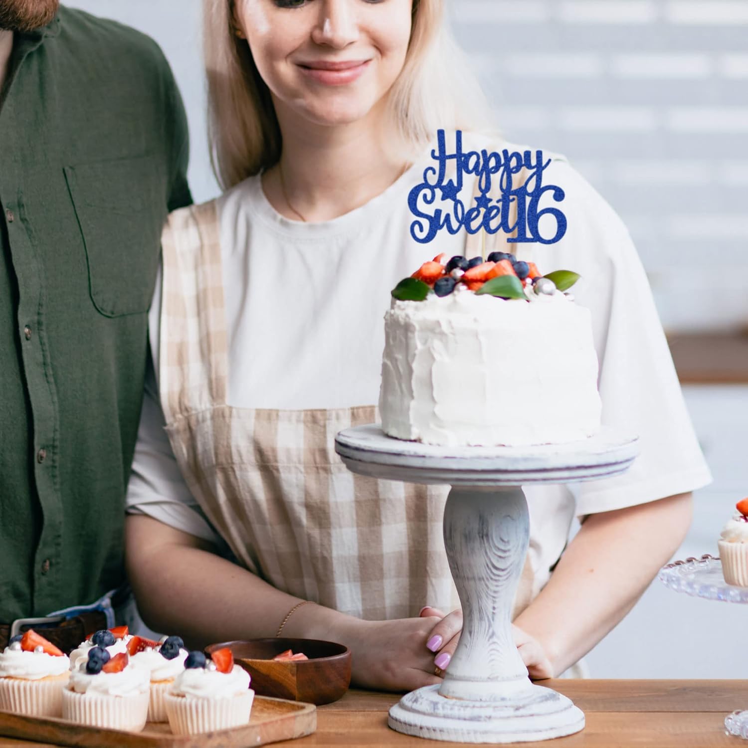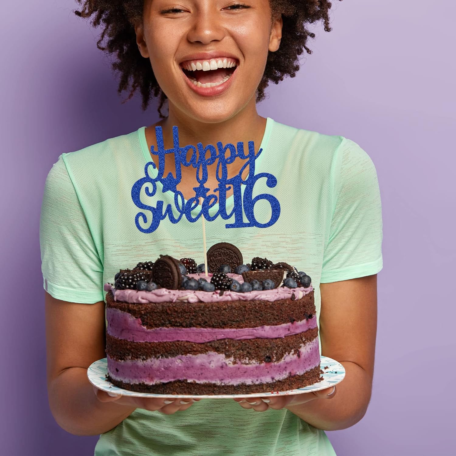 Gyufise 1Pc Happy Sweet 16 Cake Topper Blue Glitter Sweet 16 Birthday Cake Decoration Happy 16th Birthday Decorations for Girls Boys Party Supplies