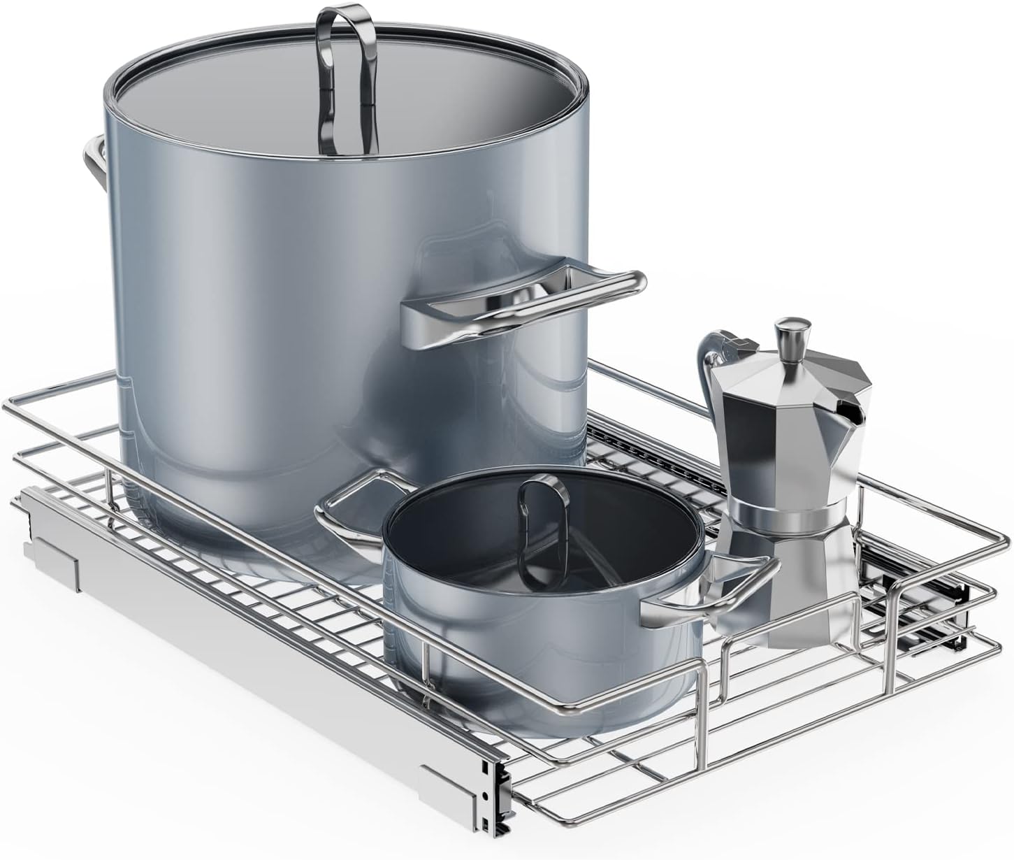 - 【Space-saving Pull Out Cabinet Organizer】This slide out cabinet organizer can maximize your cabinet space. Makes it super easy to store, organize, and access your stand mixers, pots, pans, baking sheets and other kitchen accessories, cleaning supplies, and various odds and ends. Now your cabinet is no longer just stacks of pots pans. You can contact seller via Amazon Messages to make sure if the size fit your cabinet.