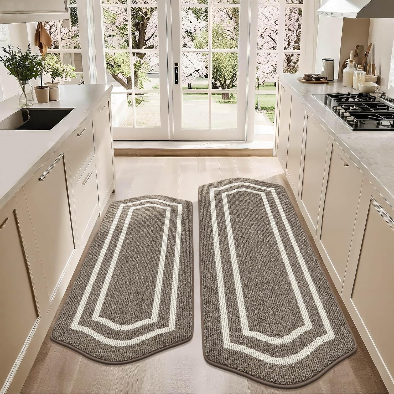 COSY HOMEER Long Kitchen Floor Mats for in Front of Sink Super Absorbent Kitchen Rugs and Mats 24"x48"+24"x59"Non-Skid Kitchen Mat Standing Mat Washable,Polypropylene,Brown,Frame