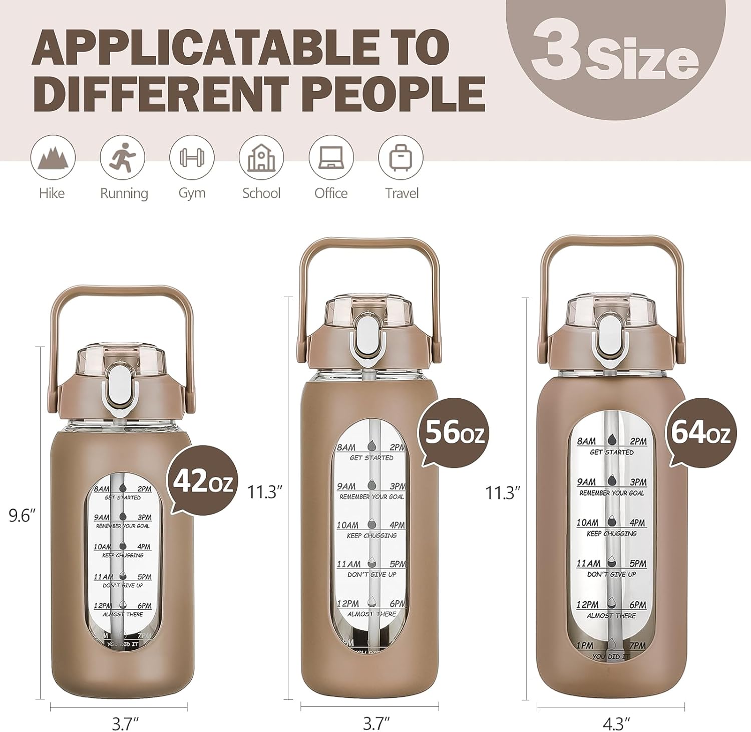 - ❤More Function- Our glass water bottle with stylish silicone sleeve which provides more grip and prevents the water bottle from slipping out. -This large motivational water bottle has a wide mouth, not only easy to hold ice cubes and fruit but also very easy to clean, you can use our complimentary cup brush to clean your water glass. -Handle on the lid for easy portability.