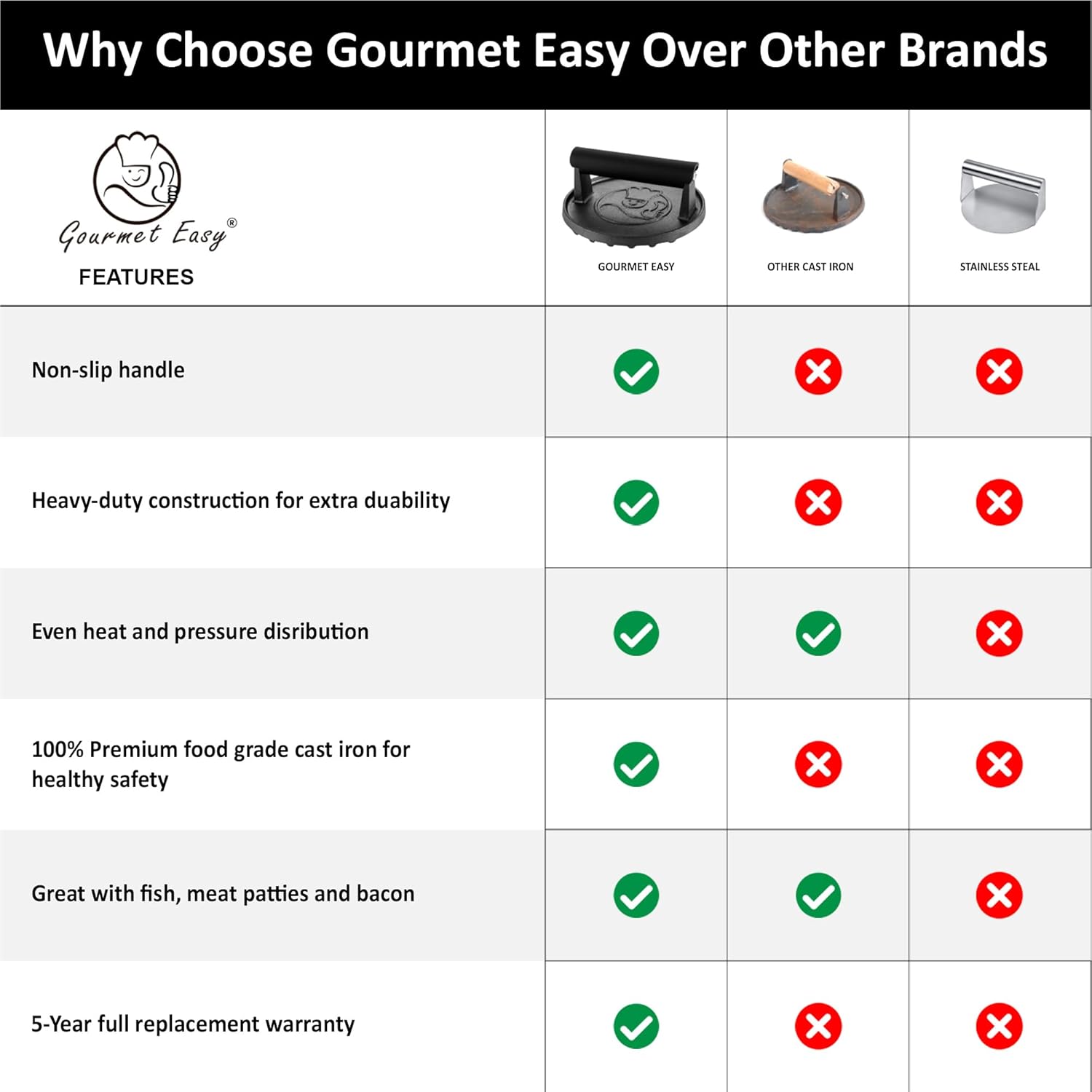- GREAT GRIDDLE ACCESSORY! Gourmet Easy high-quality grill press for smash burgers is engineered for equalized weight distribution and high heat that locks in the flavor of your meat. It can be used on grills, grates, gas, electric, and induction stoves. it's your go-to partner for indoor kitchens, outdoor BBQs, camping, and flat-top grilling.
